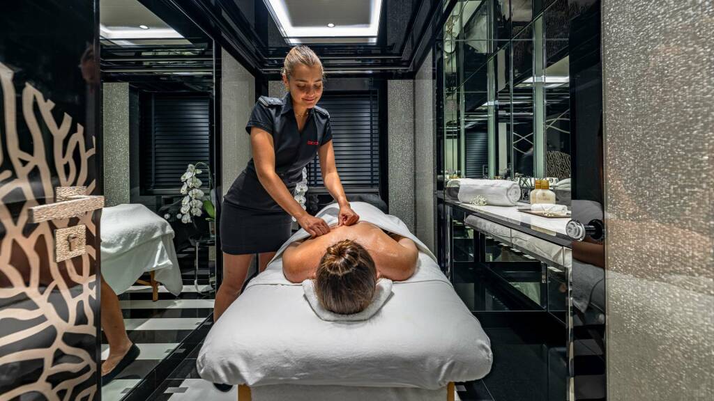- Full beam master suite with a private balcony (on starboard) . The balcony comes with an air curtain to keep the interior spaces cool, whilst having the balcony open to the sea.