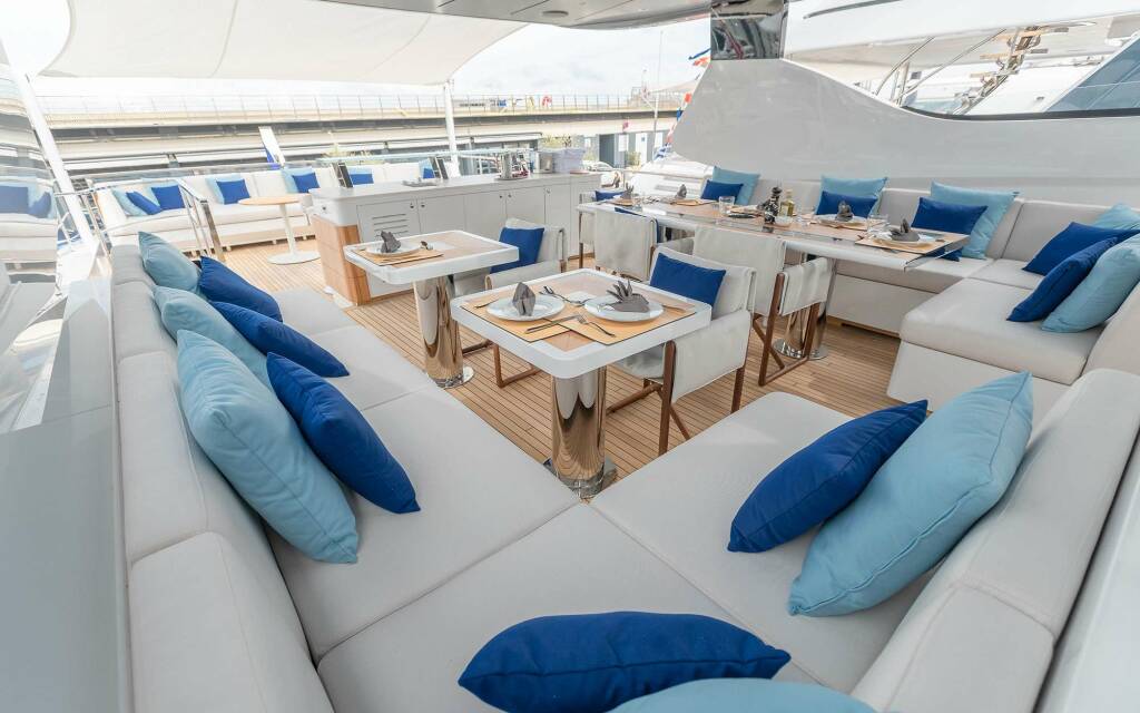Floor to ceiling windows and doors surround the main deck salon allowing guests to feel as if they are outside while protected indoors when needed. The formal dining seats 8 guests while the aft and flybridge dining, in true al fresco style will seat more, especially lending shade cover overhead as well. In addition to the lounge area on the flybrdge aft combined with high top bar, guests have an equally as large al fresco dining, sunning and Jacuzzi area forward with shade option.