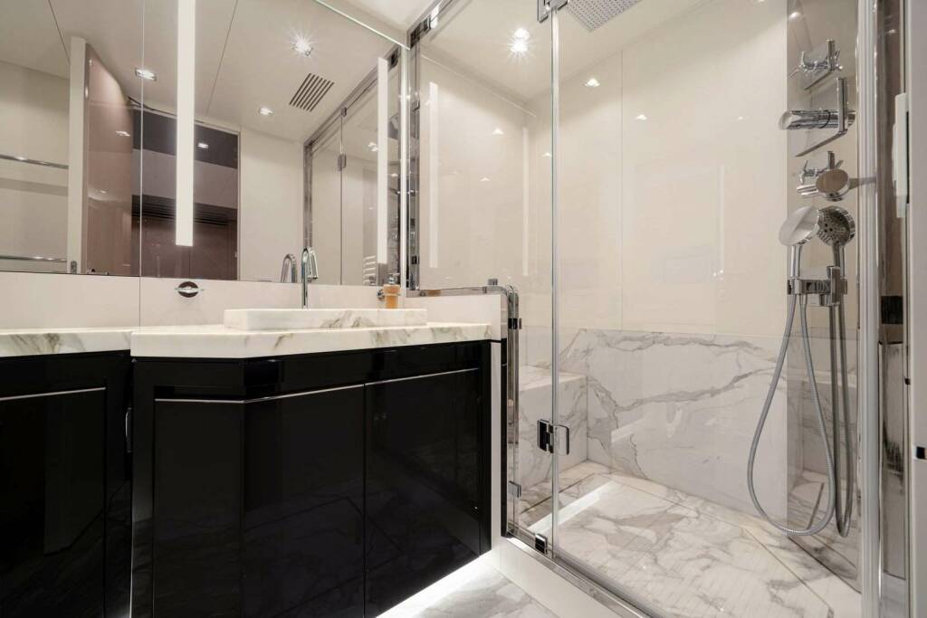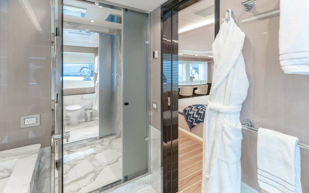 On deck Master Stateroom forward with a large walk in shower with steam feature. Long concealed hanging closets for guests.