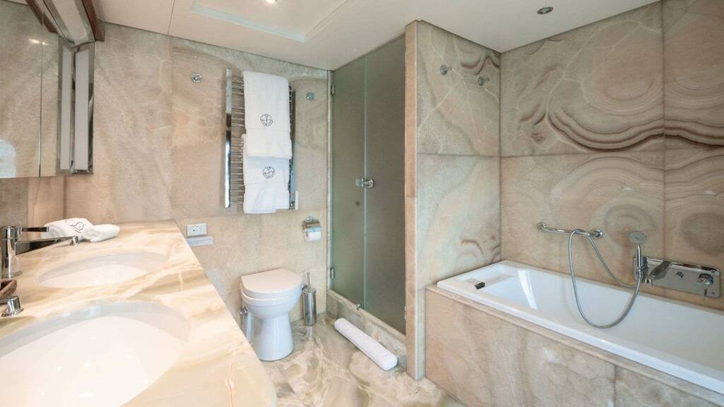 Forward on the main deck is the master suite with private office. The suite spreads full beam to ensure privacy. There is plentiful wardrobe space and a large bathroom with bathtub, double shower and underfloor heating.
