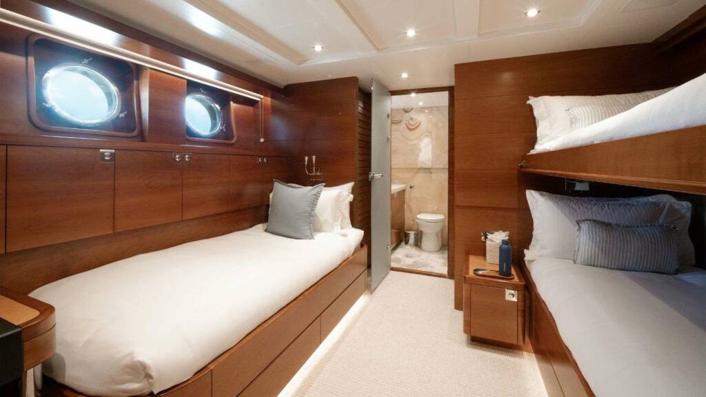 • LOWER DECK: Four guest staterooms, 2 double and 2 twins each with pullman. All cabins have plentiful storage space and bathrooms with underfloor heating.