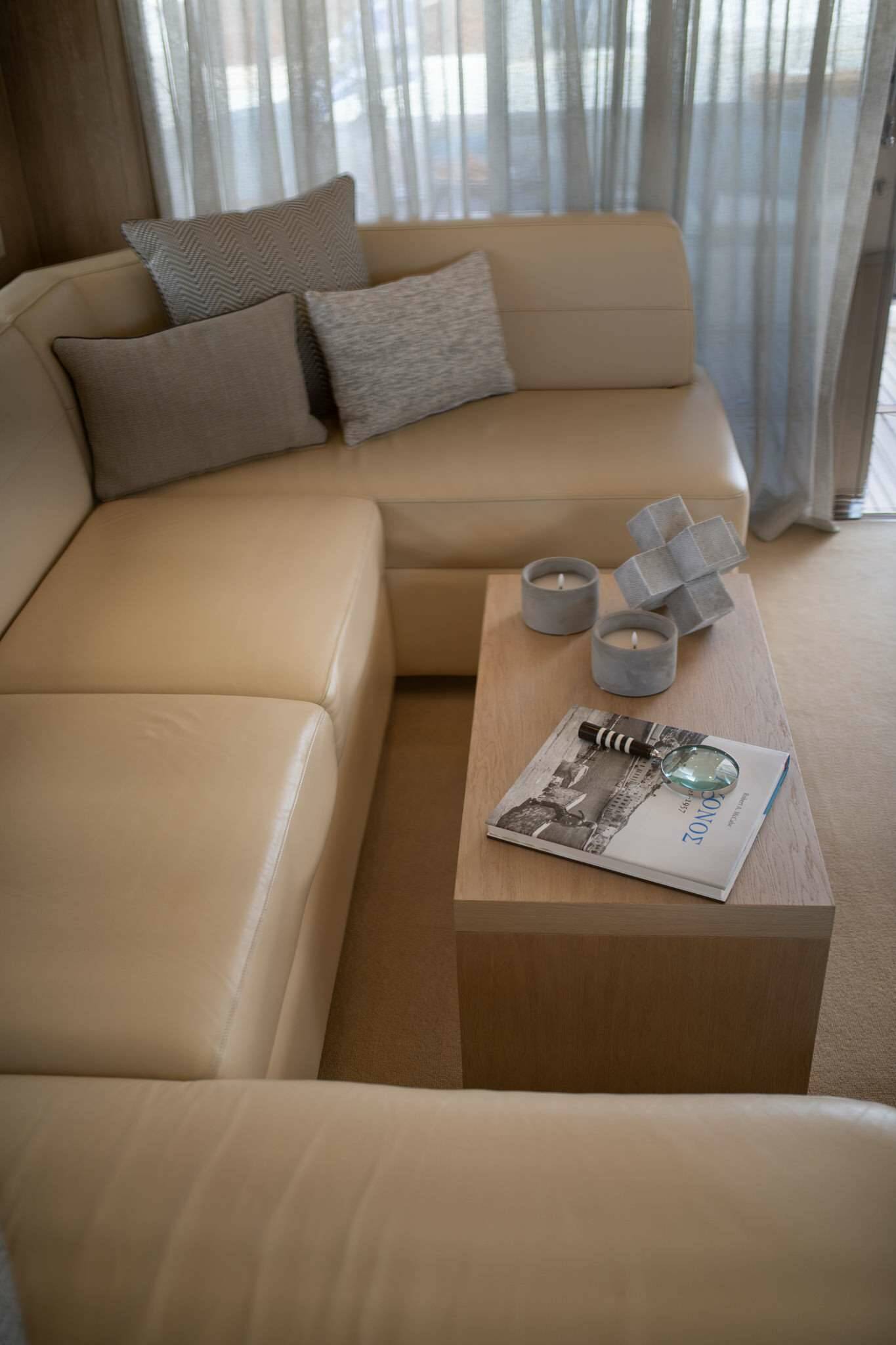Refit 2023: Re-upholstering of all cabin interior wall fabrics, new salon decoration (cushions), new exterior fabrics for leisure area (Flybridge), new Jet Ski Spark Trixx