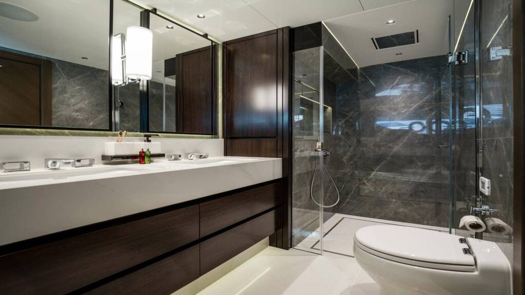 Accommodation: Accommodations aboard this yacht are thoughtfully designed to offer both comfort and privacy for all guests. Forward, down a set of steps near the helm station, you’ll find a spacious VIP stateroom positioned at the bow, featuring a plush queen bed, generous storage, and a private en-suite bath. Midship, another staircase leads to the elegant -beam master suite, complete with a luxurious en-suite and ample natural light, along with one additional queen stateroom and one convertible cabin that can be arranged as either twin or double—perfect for flexible accommodations.