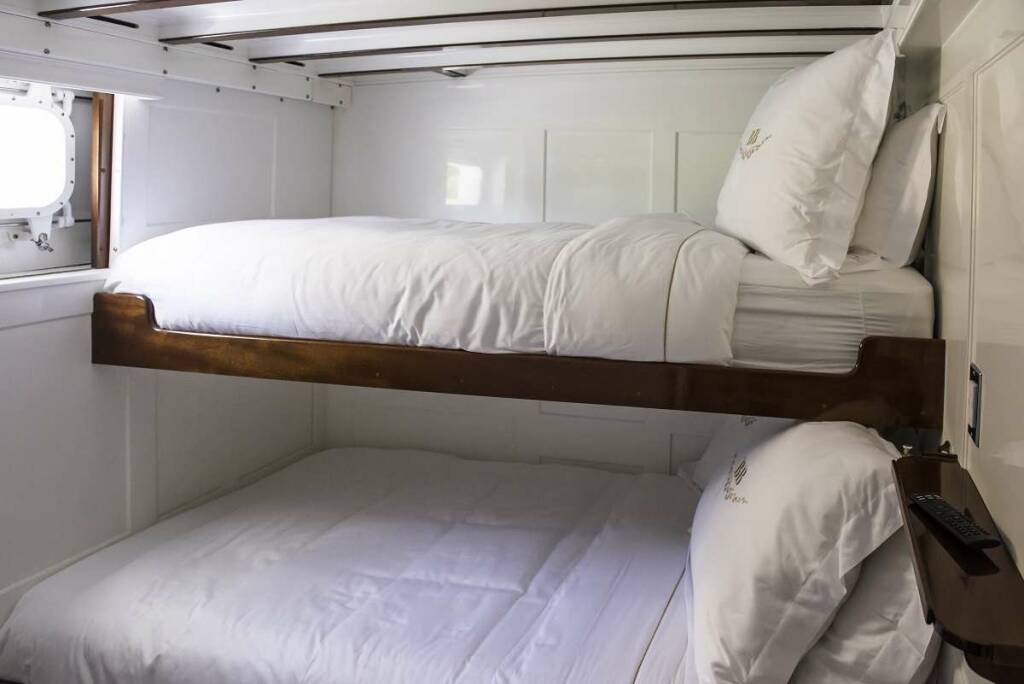 Guest Cabin 3: opposite the VIP cabin is the 3rd guest cabin that has been nick-named the “Nanny Cabin” -- as it has a lower double bed and upper single bed, a large hanging locker and generous dresser and the en suite bathroom is what is referred to as a “wet head” because it has an integral shower. The teak-grated flooring speeds drying after a shower and there is a sink with original mirrored medicine cabinet. The Nanny Cabin has air conditioning controls and ports with sliding room-darkening varnished teak shutters.