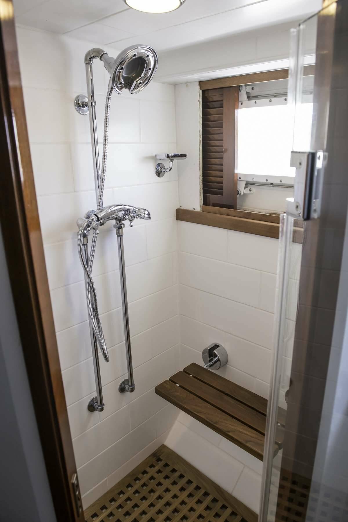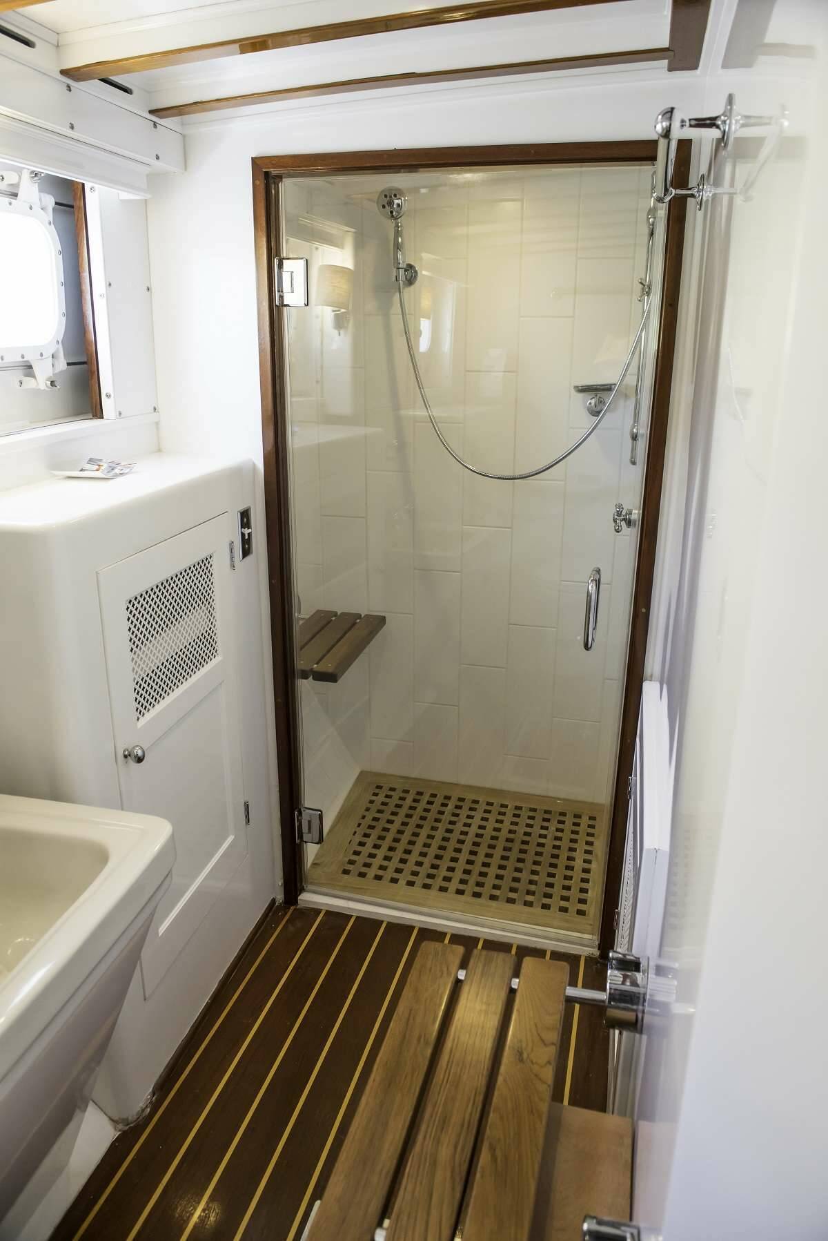 VIP Guest Cabin: Exiting the master stateroom, the starboard VIP guest cabin has a walk-around queen bed and a large bathroom that can be accessed through the cabin or via the hallway. There are two large dressers, generous hanging lockers, period lighting, ports with sliding room-darkening varnished teak shutters and private climate controls. The ensuite bath has a teak & holly sole, a large, tiled stall shower with teak grating, porcelain sink with mirrored original medicine cabinet, and Tecma fresh water flush head (toilet).