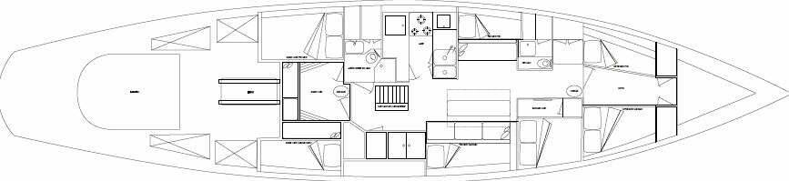 Focsle: One wide-single and one single bunk, both with privacy curtains. Large overhead hatch makes a light, airy space