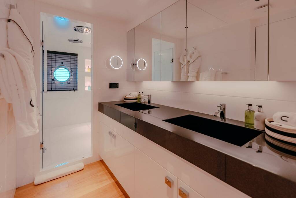 2 Twin/Convertible cabins (4 single beds, each 80 x 200 cm that can be converted into two queen-size beds ) with ensuite bathroom, shower, safe and TV.