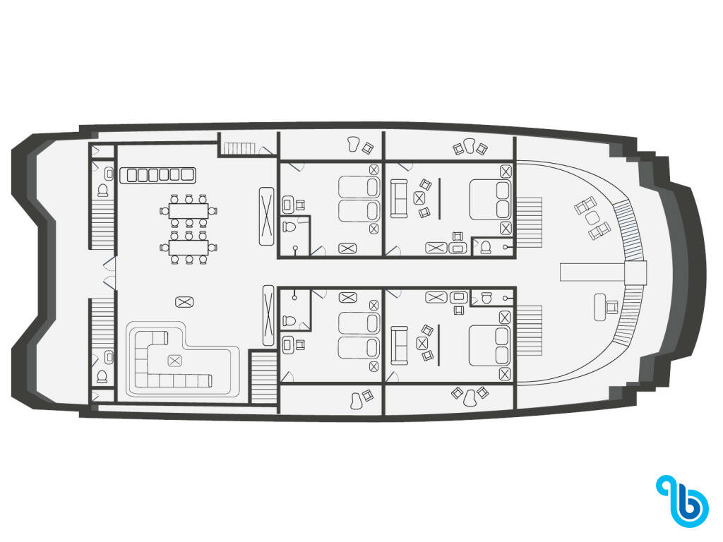• Katamaran — przestronne wnętrza, wysoka stabilność i większa prywatność.