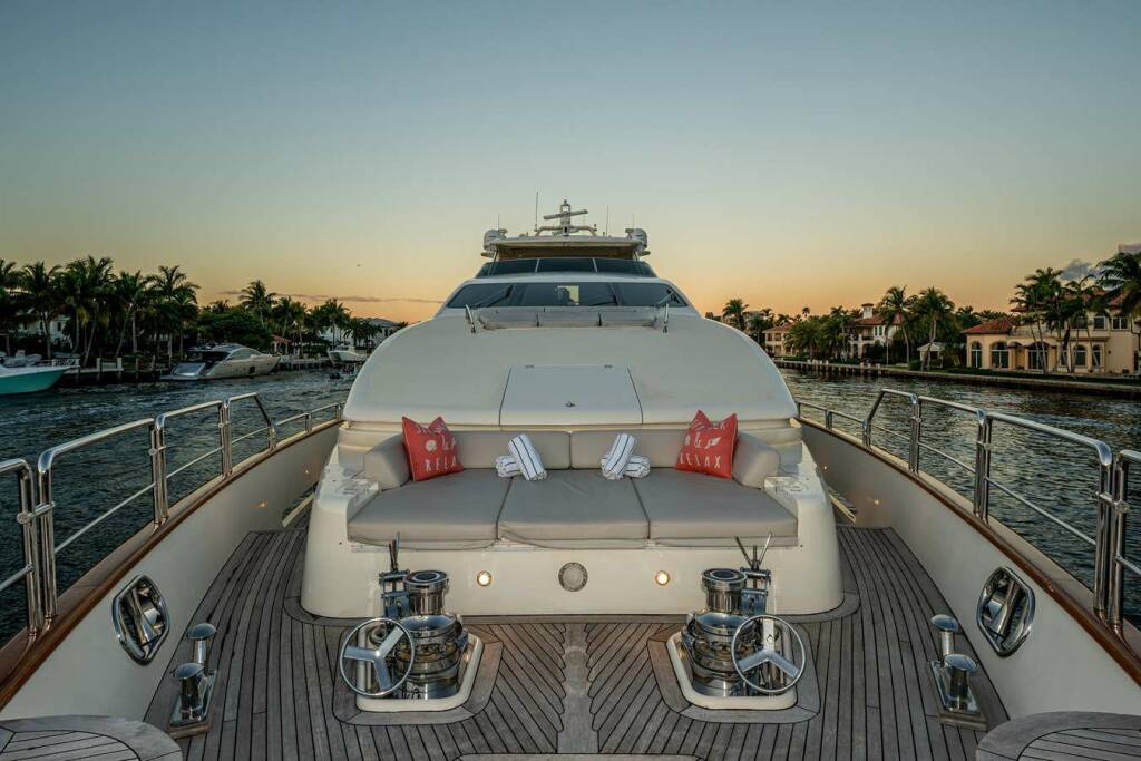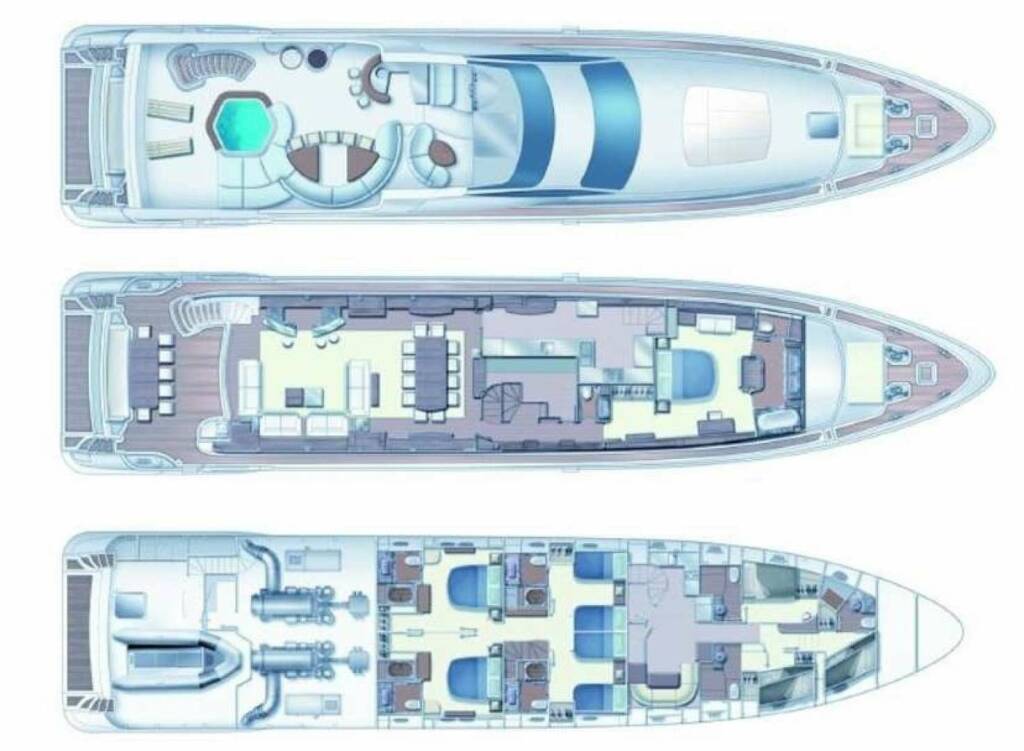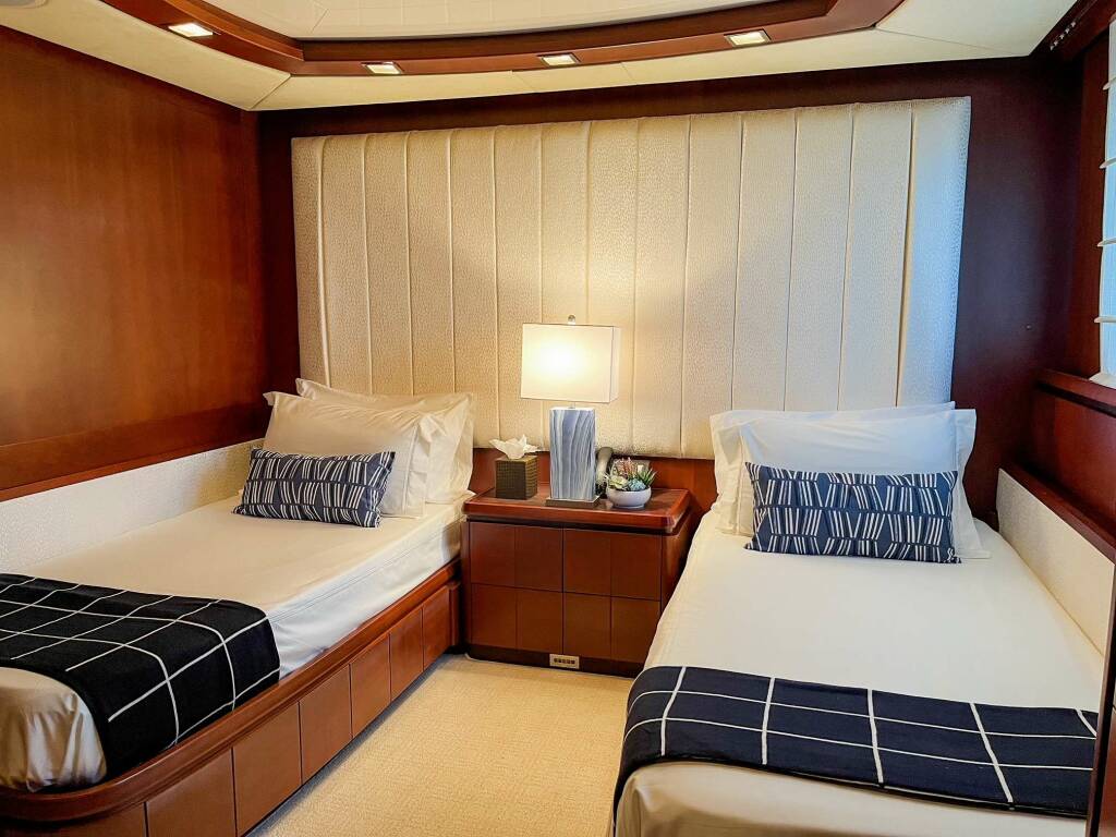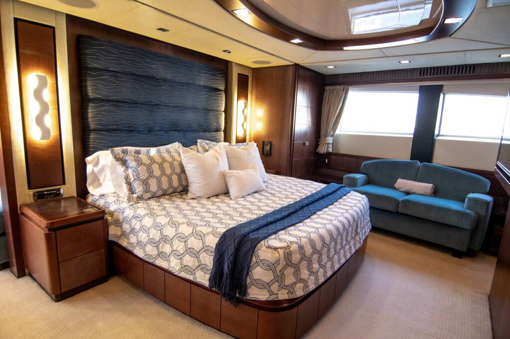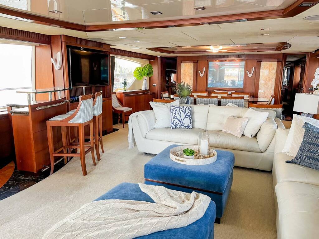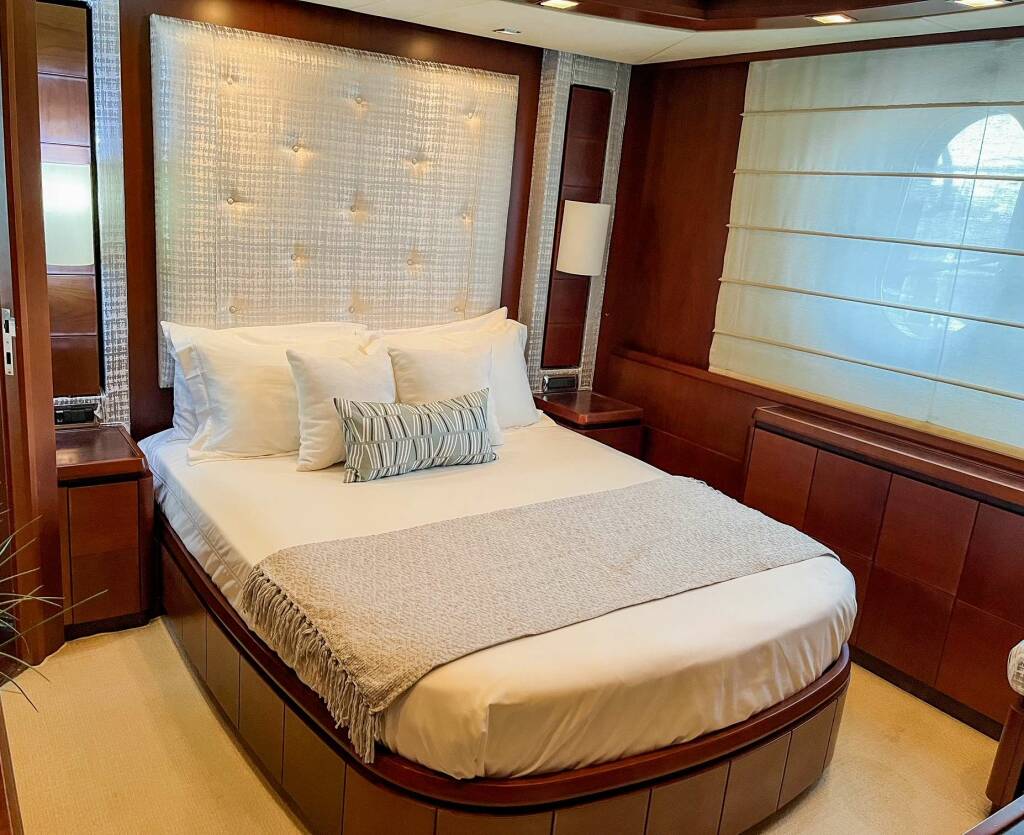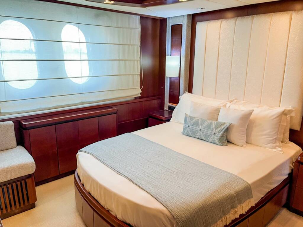 Accommodation: Spacious Main Salon with full bar area and entertainment center, formal dining forward seating up to 10 guests with custom glass panels. Main Deck: full walk-around to large high bow with upper and lower sunpads, aft deck seating for 10 w/ wet bar and TV. Master King forward on Main deck with large windows, ensuite marble bathroom, Jacuzzi tub, separate shower.