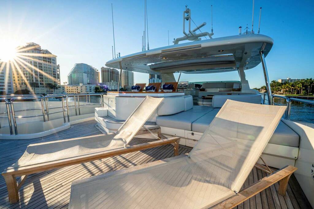 Top Deck: Large dining table with settee seating up to 10 under 2 retractable sunroofs, custom Jacuzzi spa, full wet bar, sunpads and aft lounges.