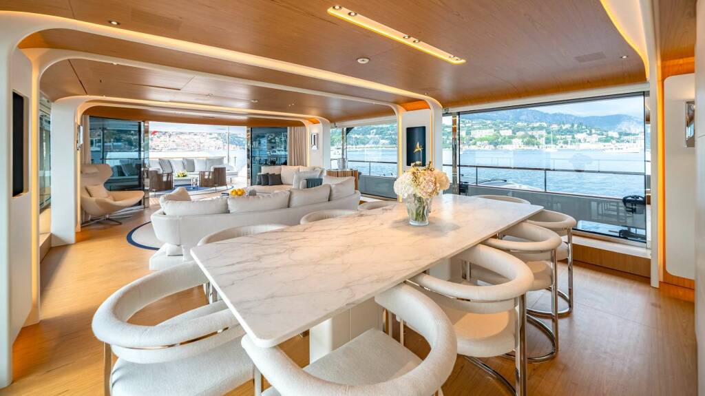Accommodation: ALLURIA offers luxurious accommodation for up to 10 guests across 5 beautifully appointed suites. The layout includes a full-beam master suite located on the main deck, two VIP cabins, one convertible cabin that can be configured as a double or twin, and one dedicated twin cabin.