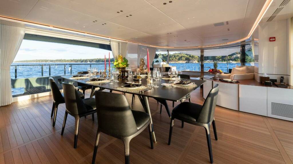 Accommodation: NORTHERN ESCAPE can accommodate up to 12 guests in a flexible five or six cabin layout, including a main-deck full-beam master suite with an office area, dressing rooms and his and her bathrooms. An additional room on the main deck provides even greater flexibility, with two fold-down pullman beds that can serve as an extra guest cabin or be converted into a wellness room for ultimate relaxation. The rest of the accommodation is on the lower deck and includes two double cabins, and two twin convertibles with additional Pullman beds.