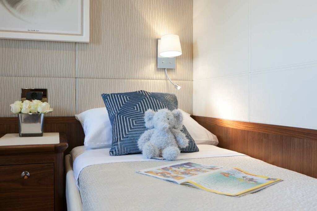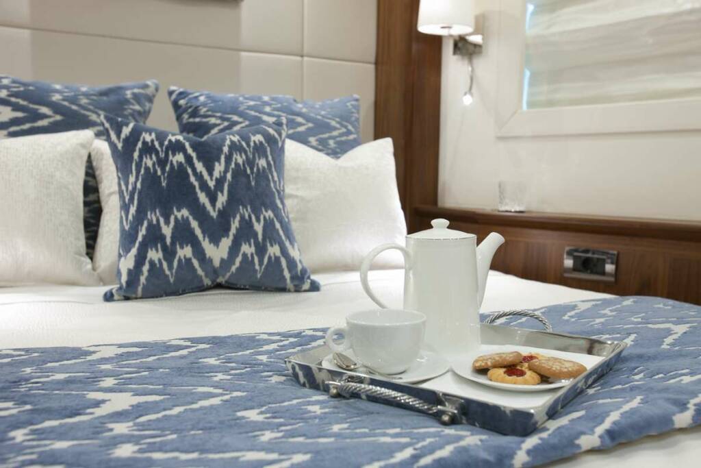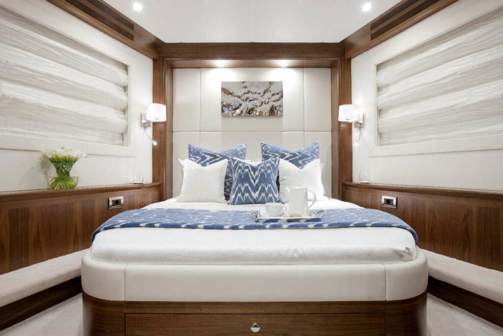 Four comfortable cabins on board accommodate up to eight guests. The full beam master suite benefits from lots of natural light from the large windows and contemporary design features. Boasting 24 square meters of floor space, the suite includes a study space, sitting area, ensuite bathroom with a bath and a walk-in closet. The VIP cabin boasts a large bed, desk and ensuite bathroom, while the two twin cabins can convert into doubles, making Firefly very flexible for any charterer size and requirements.
