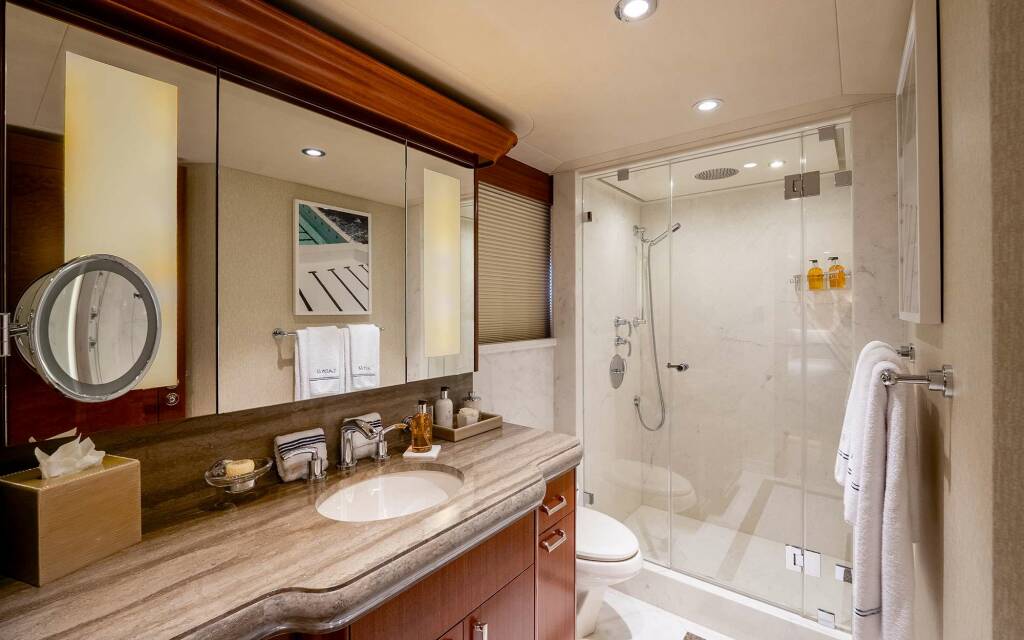 The on deck Master stateroom has a large en suite with privacy toilet + bidet, lighted make-up mirror and large marble accent shower. Generous dressers and walk in closet for his/her and safe.