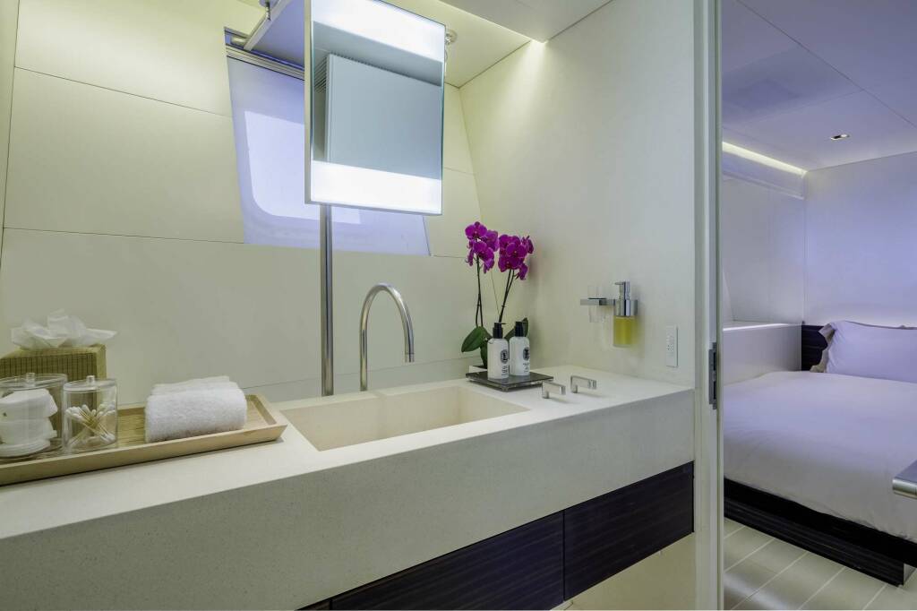 One Master cabin with a king size bed and his and hers bathroom.