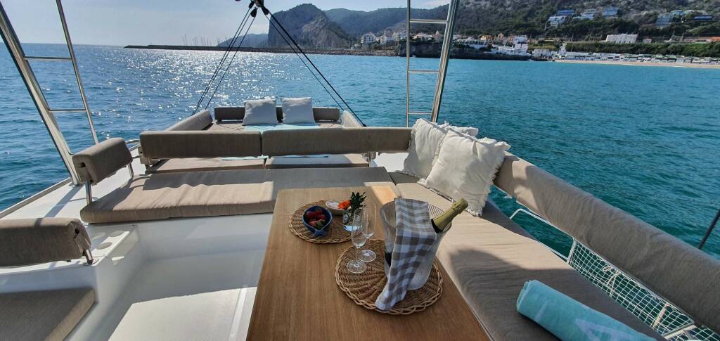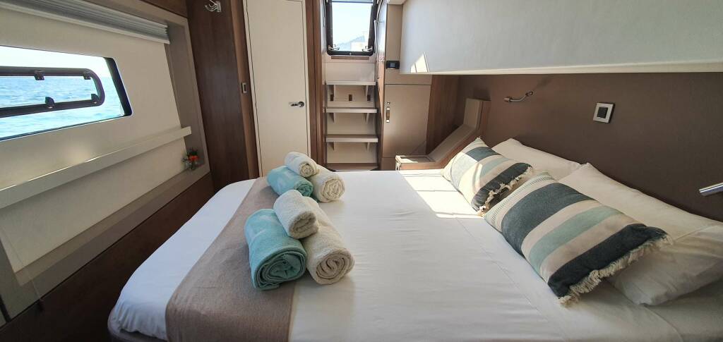 Luksusowy katamaran MARTINON, zbudowany w 2023 stacjonuje w W. Med - Spain/Balearics. Posiada 5 kabin, może pomieścić 10 osób.