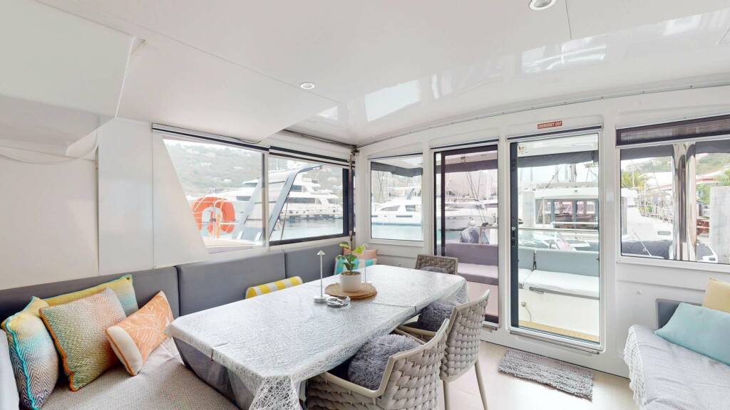 Accommodation: My Marina offers three guest cabins, including a spacious master suite that occupies the entire port hull. The additional two guest cabins are located in the starboard hull, each thoughtfully designed for comfort and privacy—perfect for families or friends sharing an unforgettable Caribbean yacht charter experience.