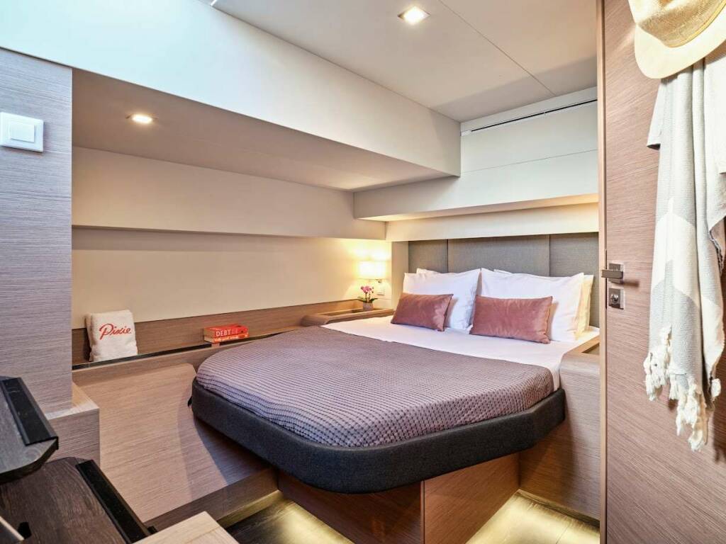 Accommodation: PIXIE can accommodate 9 guests in total. She has 1 master cabin with queen size bed (size between queen and king bed) a desk area, a full bathroom with a double sink, and two entrance points (one entrance from the inside of the boat and the other from the foredeck jacuzzi area). Two queen-sized guest cabins with private bathroom. One triple cabin with one double bed and one single bunk bed above with private bathroom.