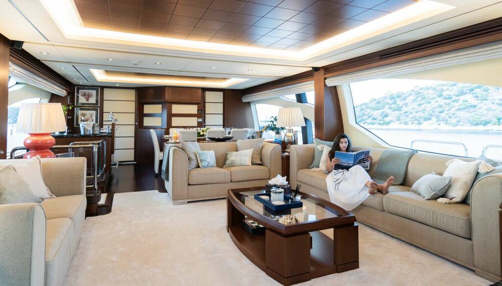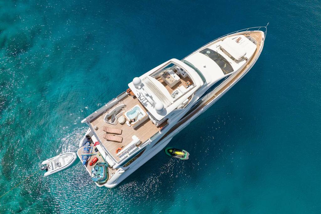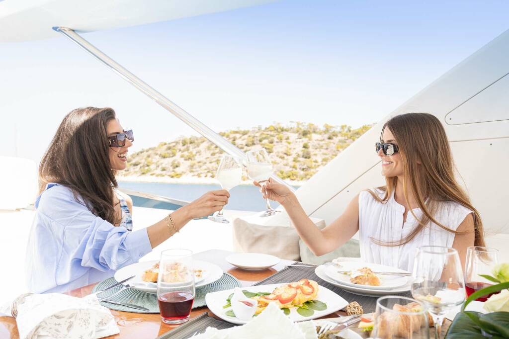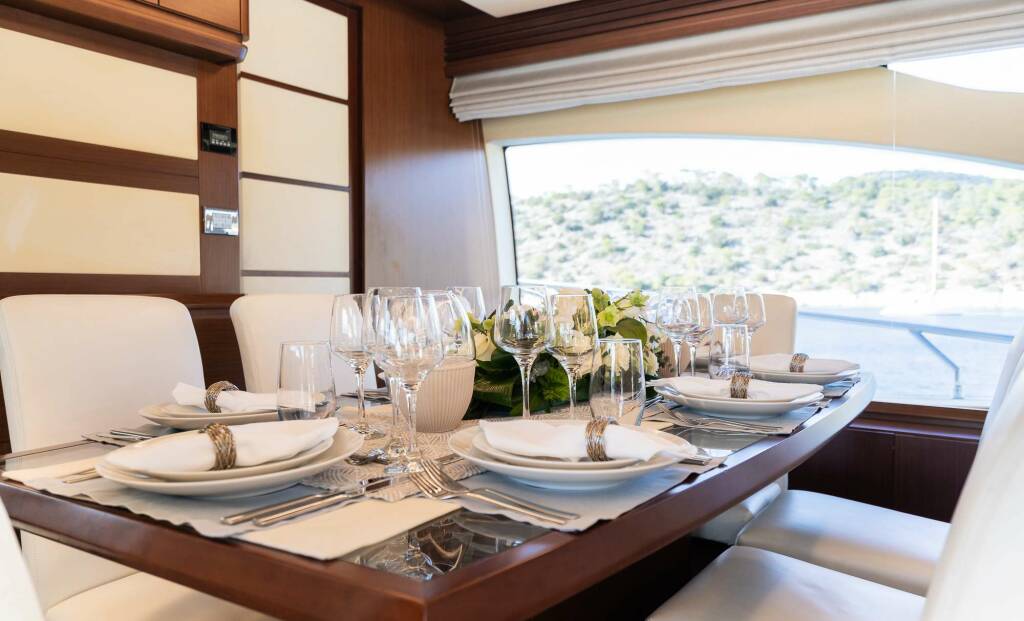 She boasts expansive deck space with multiple areas for relaxation, featuring a large foredeck with optional sunshade and sunpads, the perfect area for privacy when at anchor in busier ports. On the flybridge there is more comfortable seating, along with sun pads, a wetbar, a BBQ, a four person Jacuzzi and lounging chairs. This entire area can also be protected by a sunroof when desired. Throughout the yacht there is also an incredible top of the range Sonos sound system, the perfect addition to any onboard special event. Her fully sheltered aft deck offers an additional space for al fresco dining.