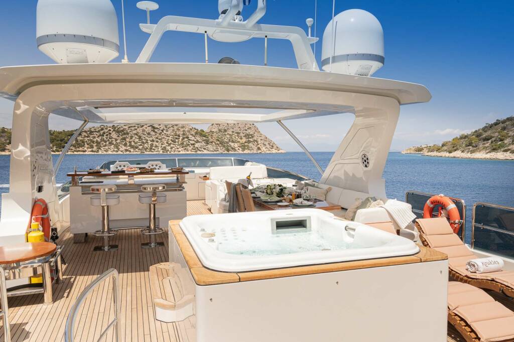 Delivered by Azimut in 2008 with a refit in 2021, Koukles is a high-performing yacht that perfectly balances contemporary design and space with comfort. During her 2021 refit her exterior and interior were upgraded as well as her interior redecorated, including the purchase of new linen, beach towels and dinnerware.