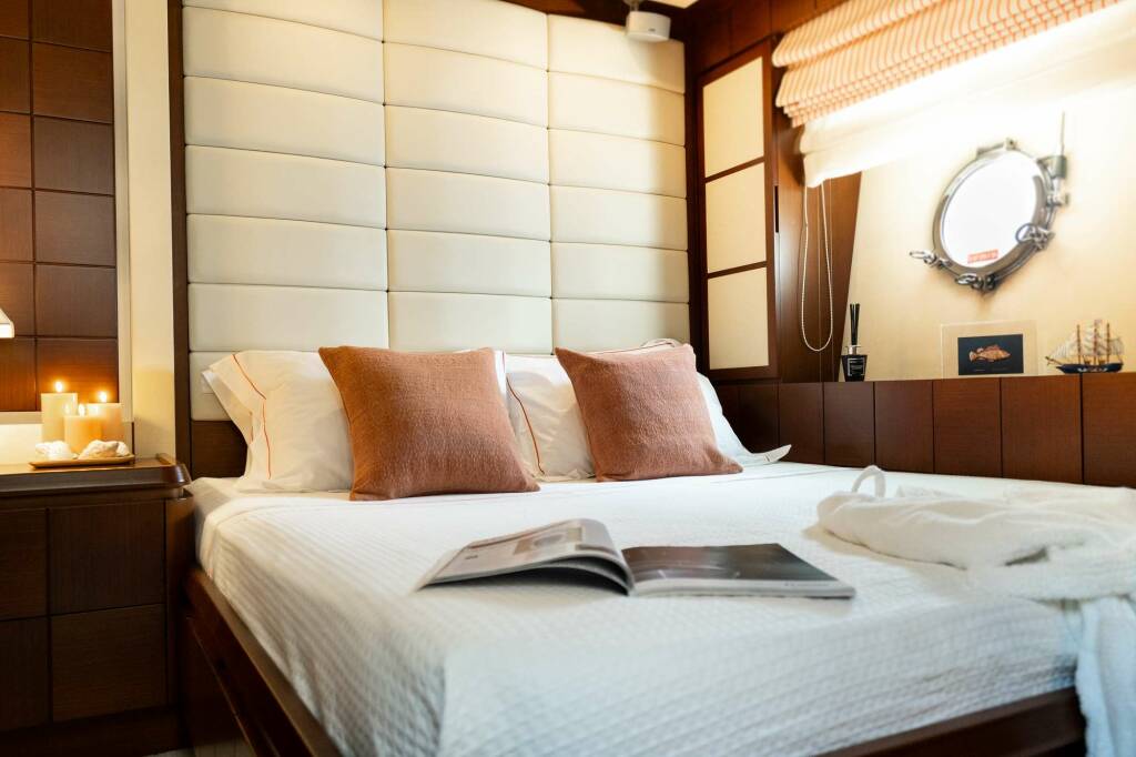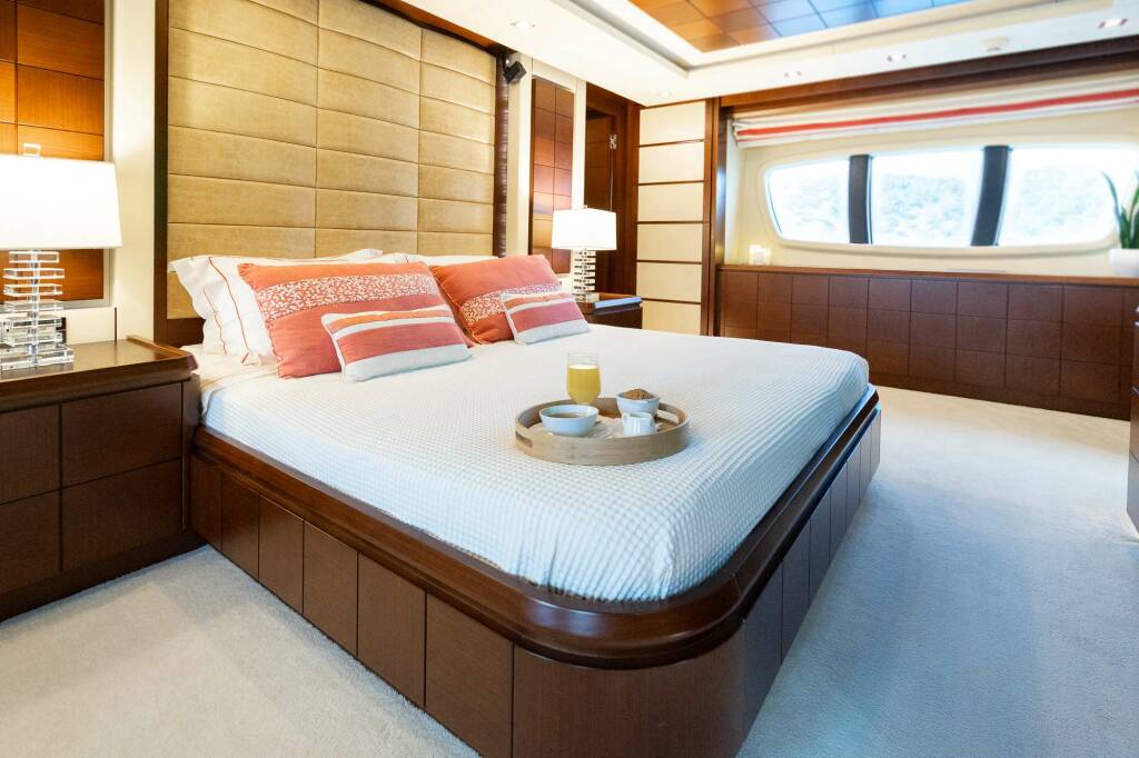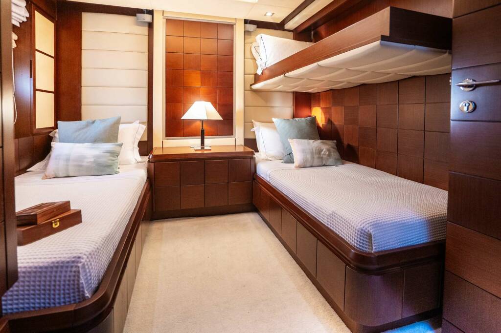 Her interior design is by Carlo Galeazzi, with fixtures and fittings in dark wood contrasting with light and modern upholstery – her main salon is open and bright and features a bar and 50-inch TV. She accommodates up to nine guests in one master suite, one VIP, one double and one twin cabin with a Pullman berth. All cabins feature entertainment centres and ensuite bathrooms. Her full beam master suite is exceptionally spacious and accessed via a private staircase, providing extra privacy and seclusion. It has a walk-in wardrobe, and the ensuite features his and her sinks, a large bathtub with a jacuzzi setting, and a shower with hydro massage.