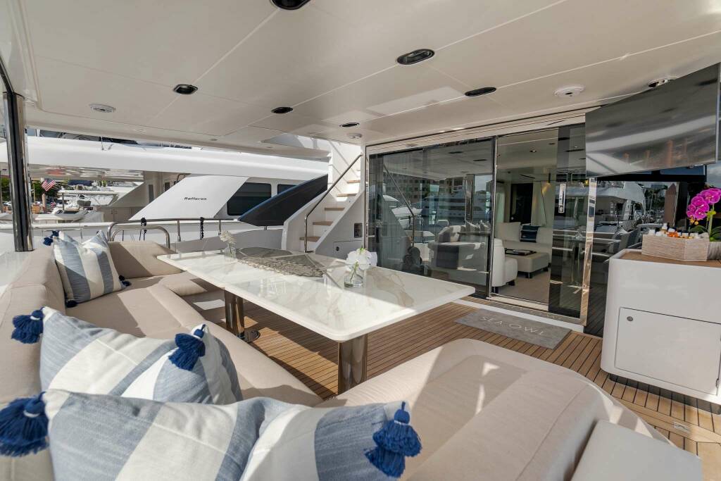 Luxusná motorová loď SEA OWL, postavená v roku 2022, kotví v Bahamas, USA - New England. Má 5 kajút, môže ubytovať 8 osôb.
