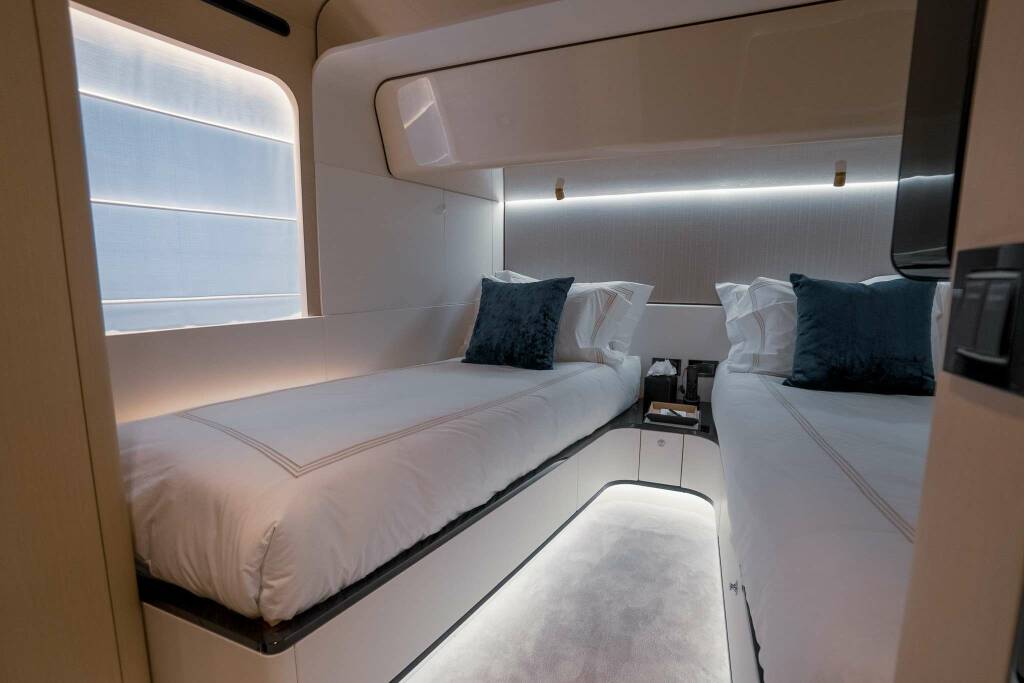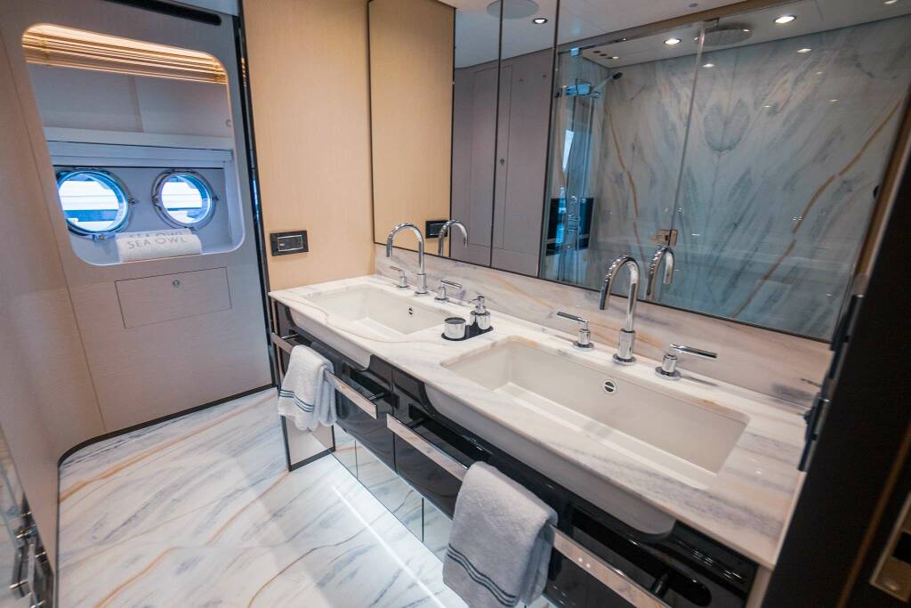 Accommodation: Master stateroom on main deck with oversized windows offering endless views. To port is a desk for working on the go, the mirrored wall separating the ensuite hides the large television when not in use. Forward of the bedroom, accessed via steps reveals an oversized, marble clad ensuite with double sinks, large standing shower with bench and private toilet.
