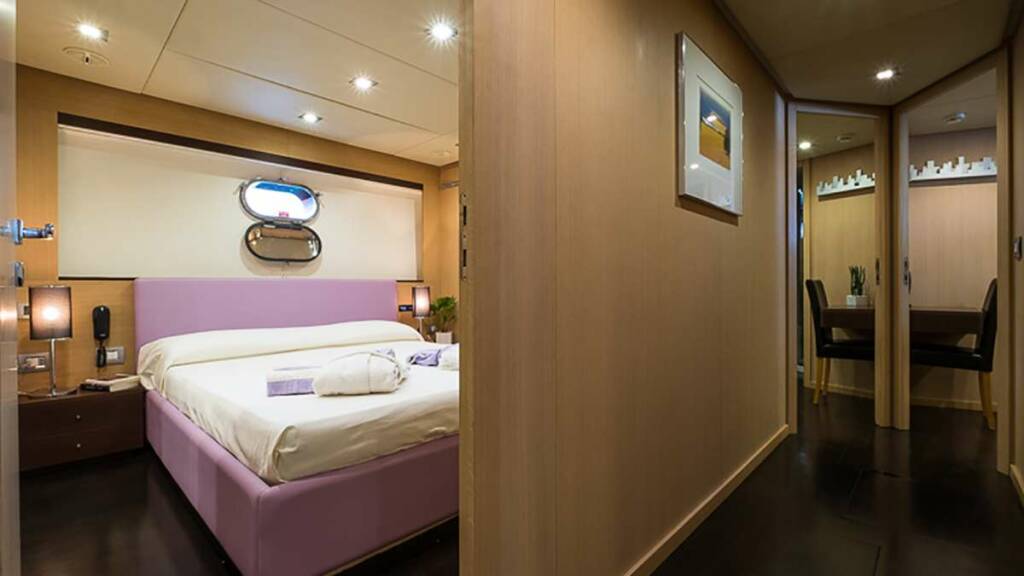 Accommodation: ARIA boasts spaces incomparable for a vessel of that size! 3 double bedded cabins and 2 twins. Each cabin has its own bathroom, desk, TV and safe.