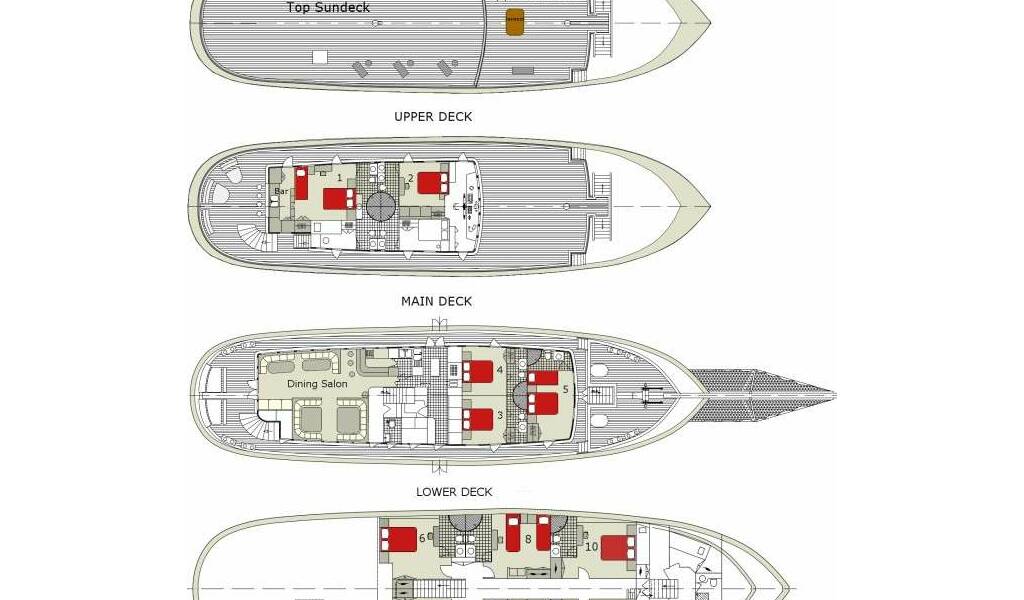 Väčšina jácht môže podľa vnútorného usporiadania ubytovať 6 až 12 hostí.
