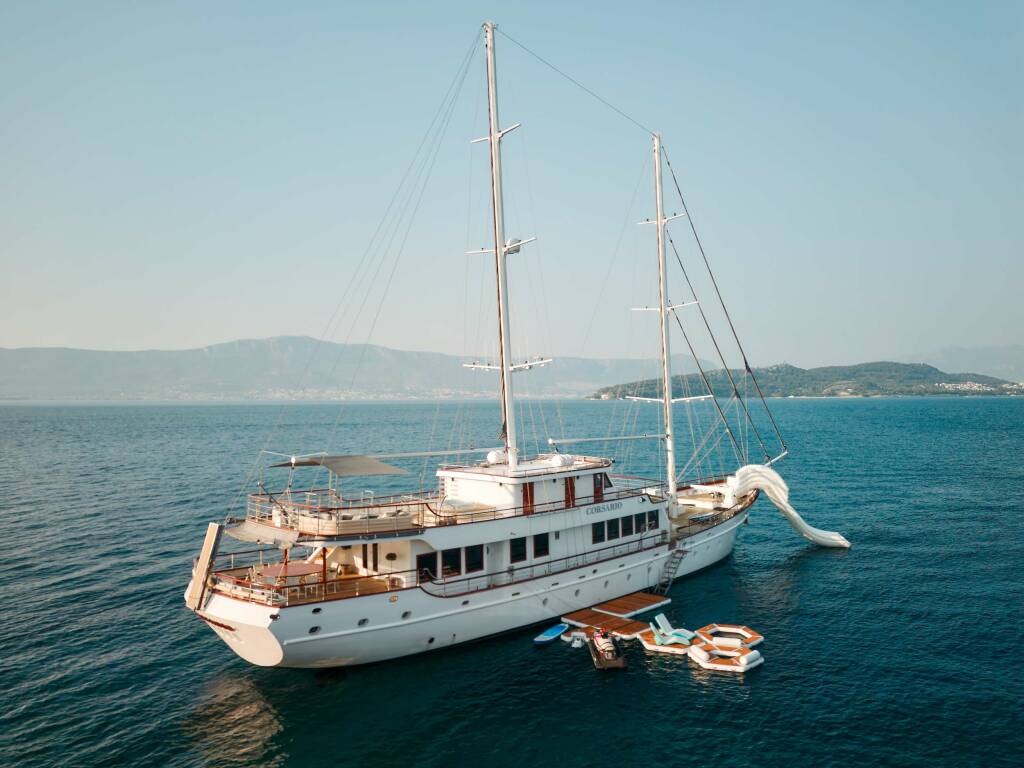 Luxusná motorová loď Corsario , postavená v roku 2019, kotví v W. Med -Naples/Sicily, Greece. Má 6 kajút, môže ubytovať 12 osôb.
