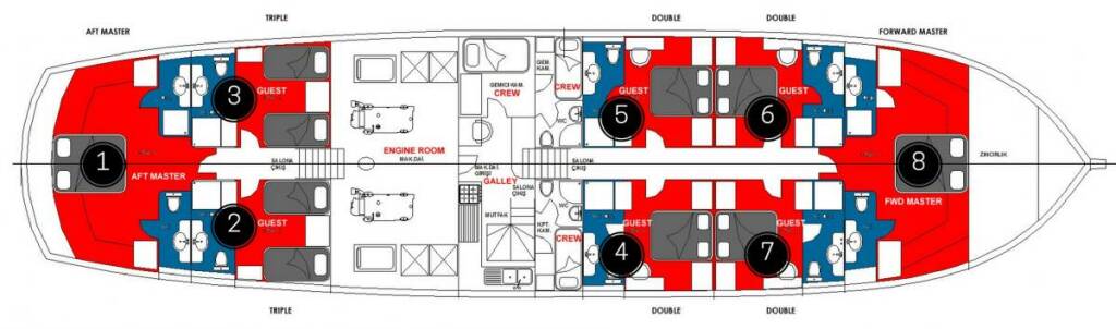 All cabins with self-controlled A/C, Satellite TV, DVD player, and en suites with showers, wc, hairdryer.