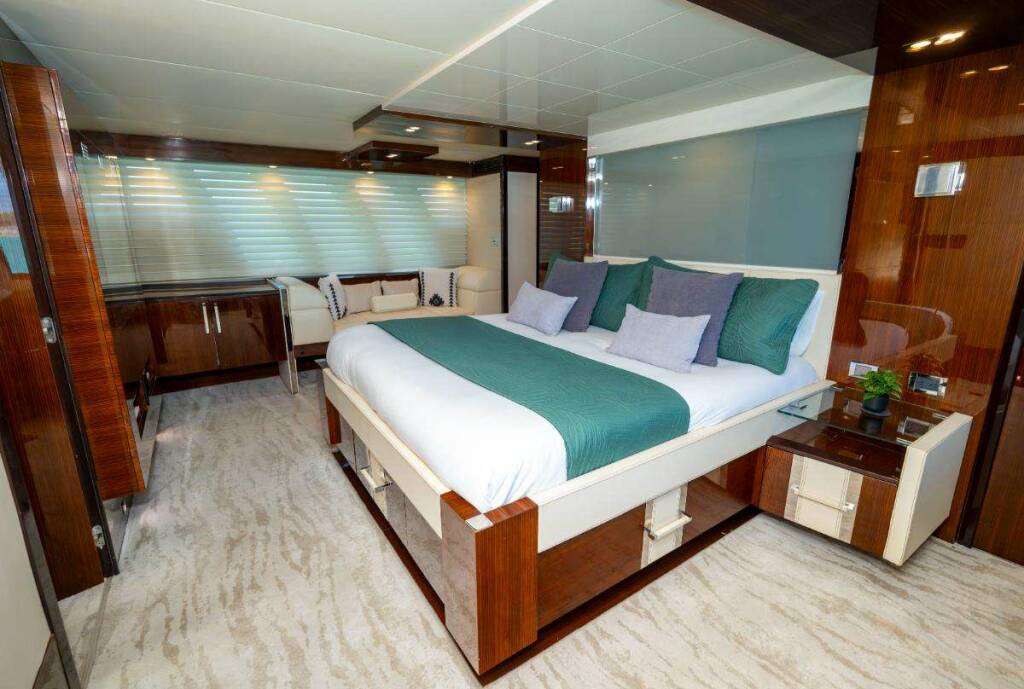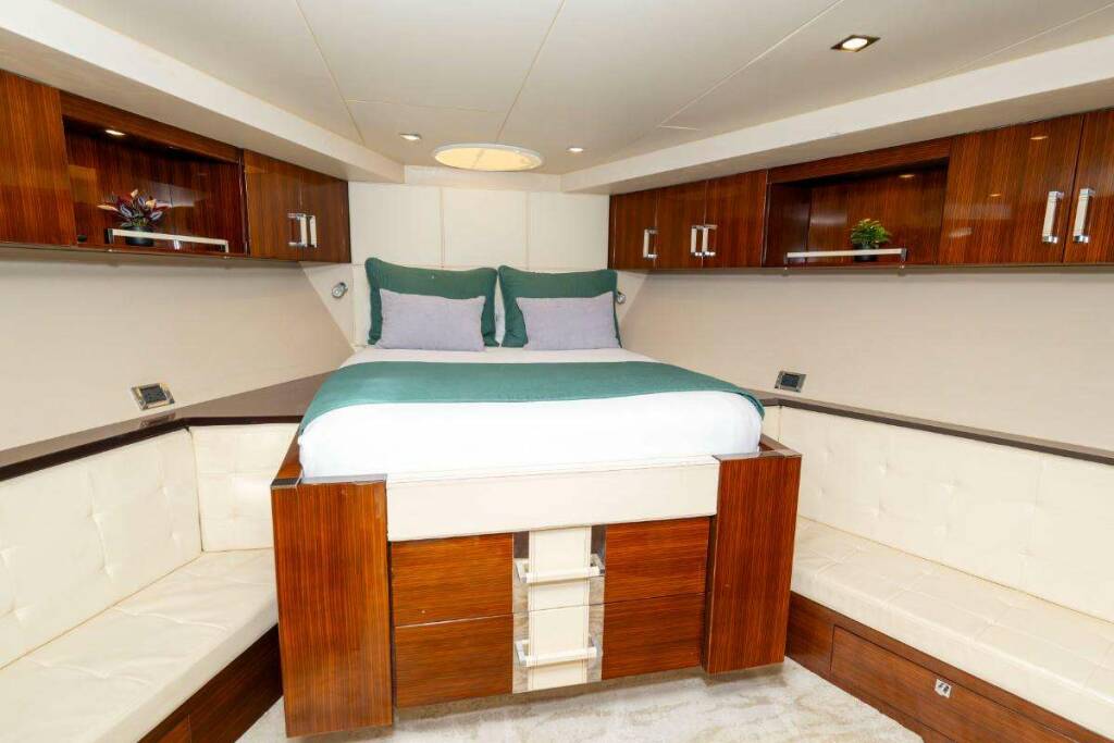 Situated midship, the full-beam master features a king-size bed, abundant storage, and large portlights that flood the cabin with natural light. The en-suite head offers a spacious shower and premium toiletries for a spa-like feel.