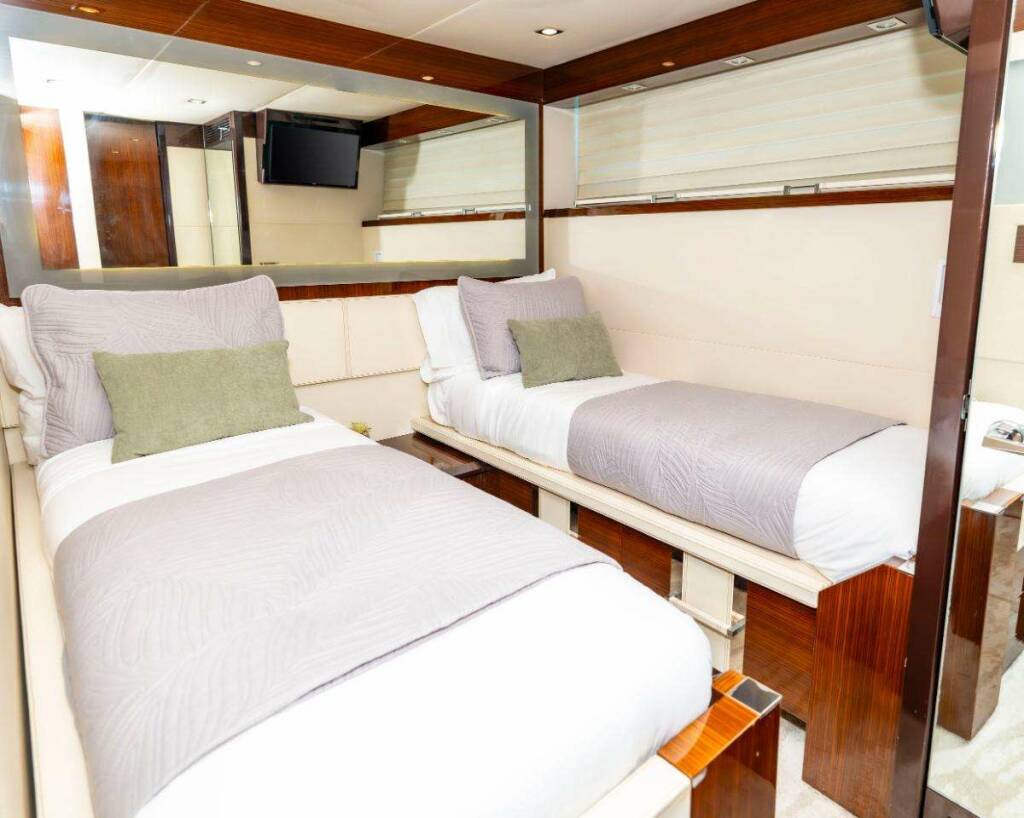 Opposite the starboard-side queen, the twin cabin is ideal for friends or family, with two single beds. This cabin can convert to a double if needed. It also boasts a private en-suite head with a full-size stand-up shower.