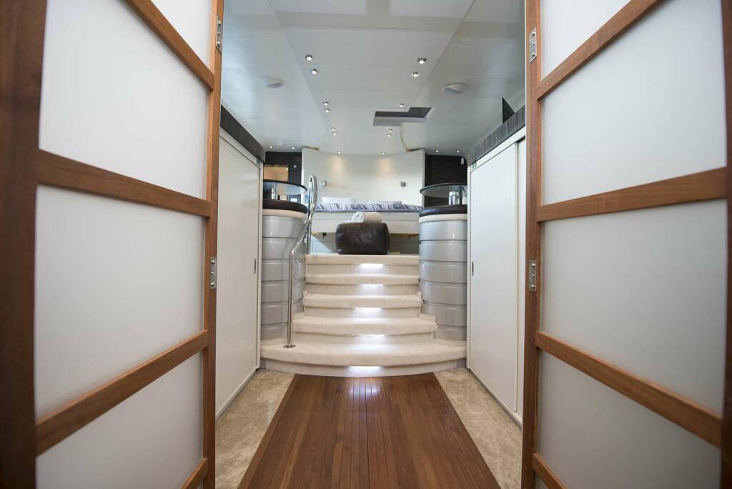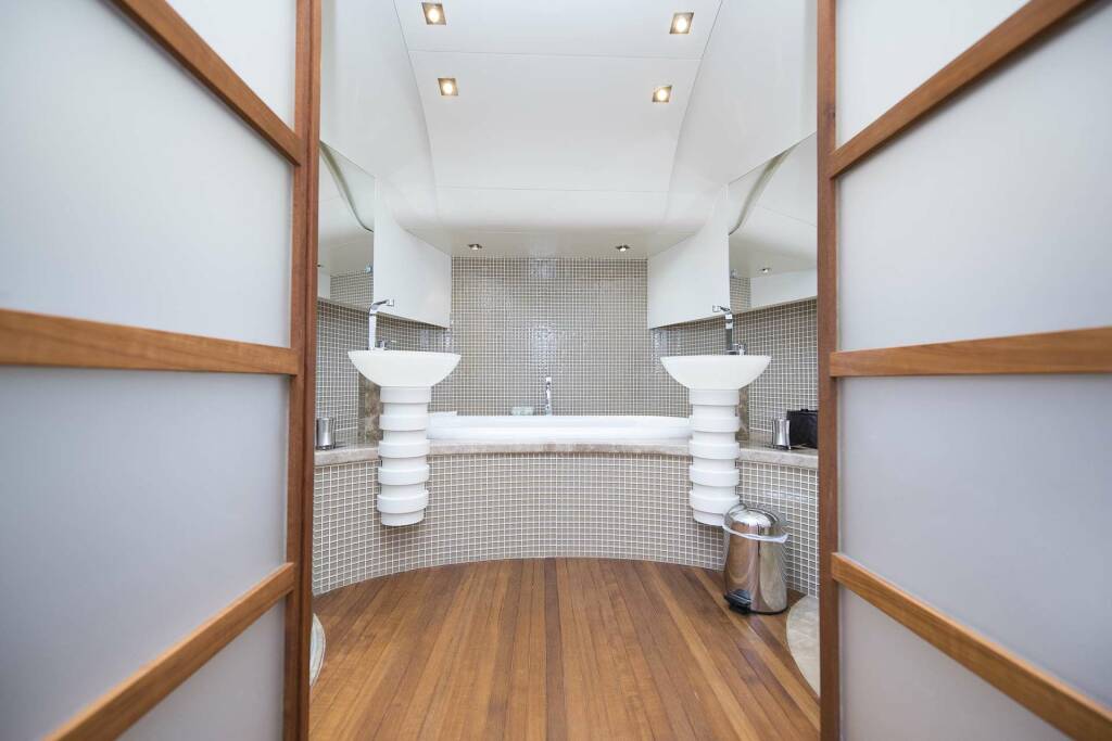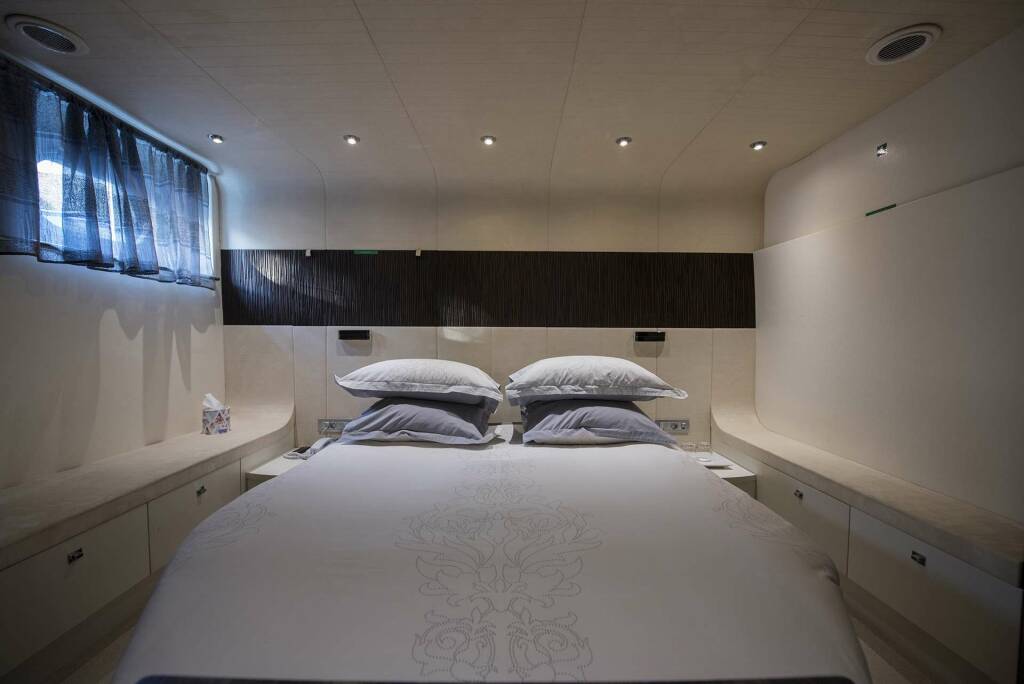 Master cabin: Full beam cabin located forward on the main deck, very bright with large windows. The cabin is equipped with a king sized bed, a desk, electric blinds, large flat screen TV and a nice size closet. The ensuite sunken bathroom has a shower, bath tub and twin basins.