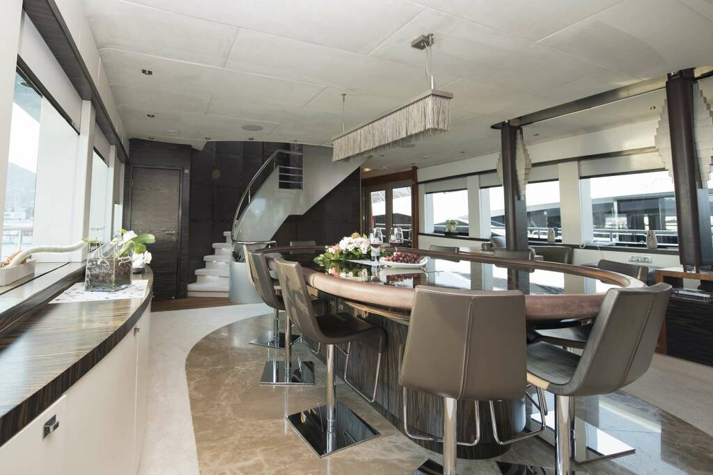On the main deck, an inside dinning table for up to 12 guests (cm 295x165). The table can be raised to convert into a bar and the 12 chairs can be converted into bar chairs. The table can be also converted into a poker table.
