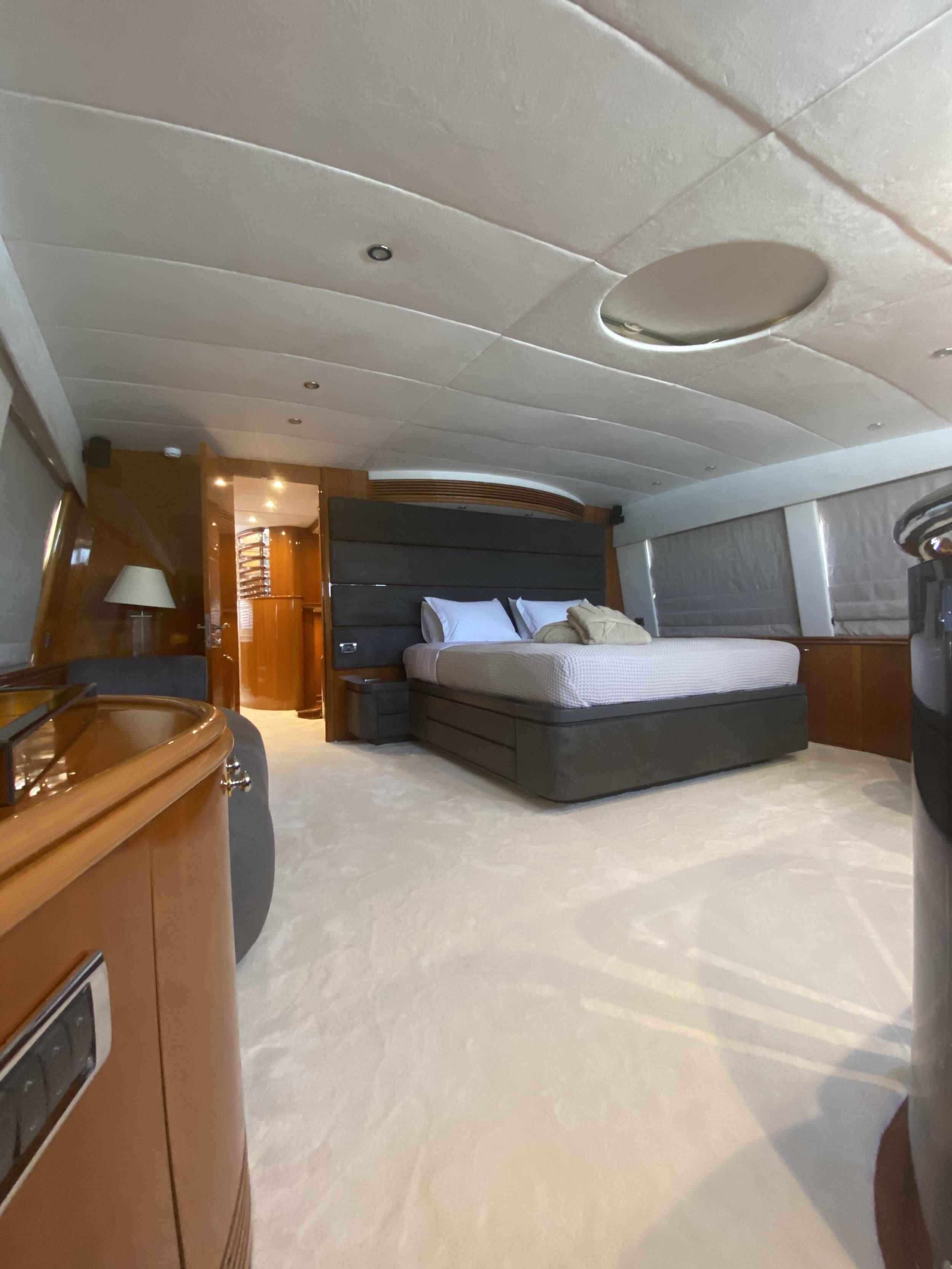 Accommodation: 1 large 3 level Master stateroom on the Main Deck with mid level dressing area with separate toilet room and an open bathroom on the lower level with tub and his & hers sinks.