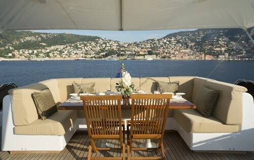 Large area with access from the bridge and the starboard side of the yacht. Dining table for 8 guests, wine fridge and small bar. Flybridge helm has seating for up to 10. Sofa seating for 6. Tender is stored on this deck and when removed there are 2 large sunbeds.