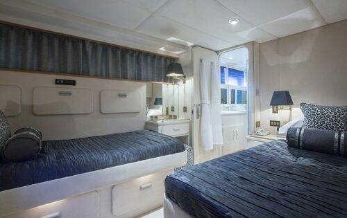 2 x twin cabins with single beds and extra pullman berths. Both with ensuite facilities.