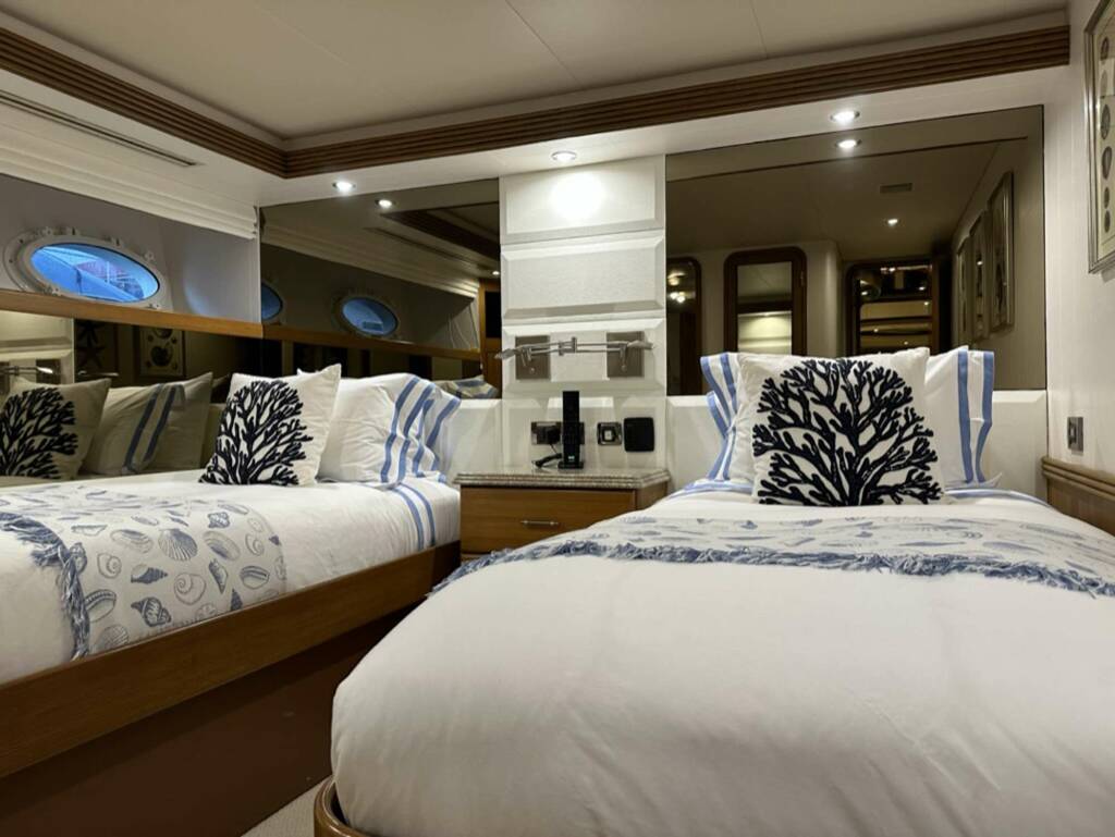 Accommodation: ISLAND GIRLS's interior configuration has been designed to comfortably accommodate up to 8 guests overnight in 4 cabins, comprising a master suite, 1 VIP stateroom, 1 double cabin and 1 twin cabin. She is also capable of carrying up to 5 crew onboard in 3 cabins to ensure a relaxed luxury yacht experience.