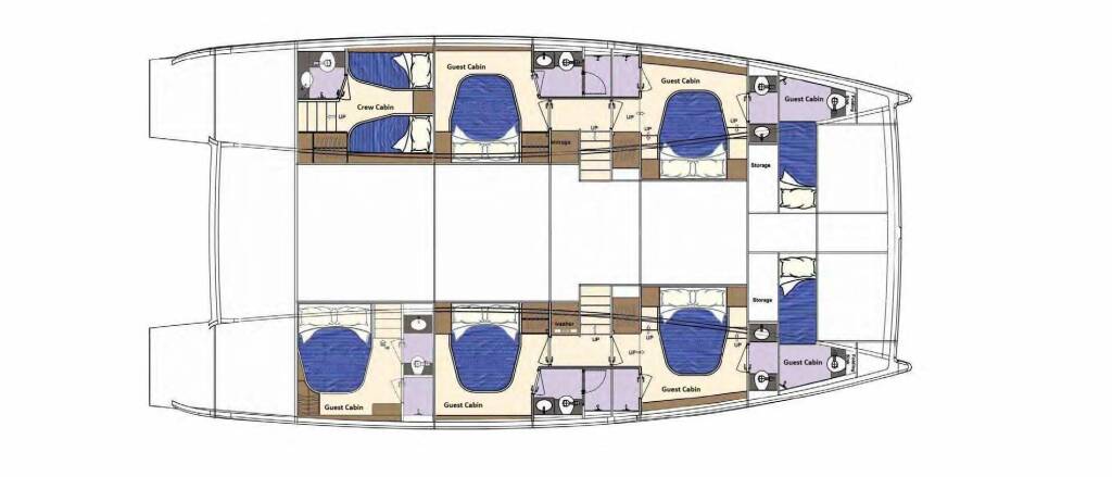 Accommodation: 5 queen cabins with en suite bathrooms for guests. 2 additional single forepeaks with own bathroom for guests. The crew uses the aft cabin with 2 separate twin beds. All main interior cabins have electric freshwater flush toilets and US electrical outlets.