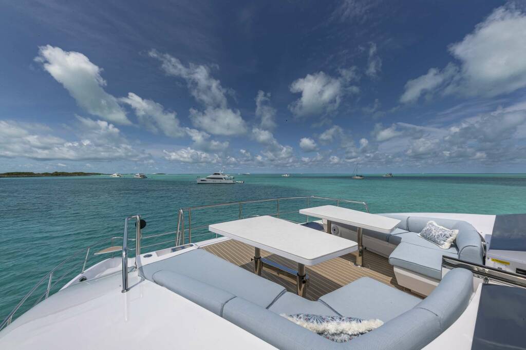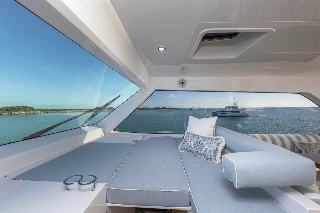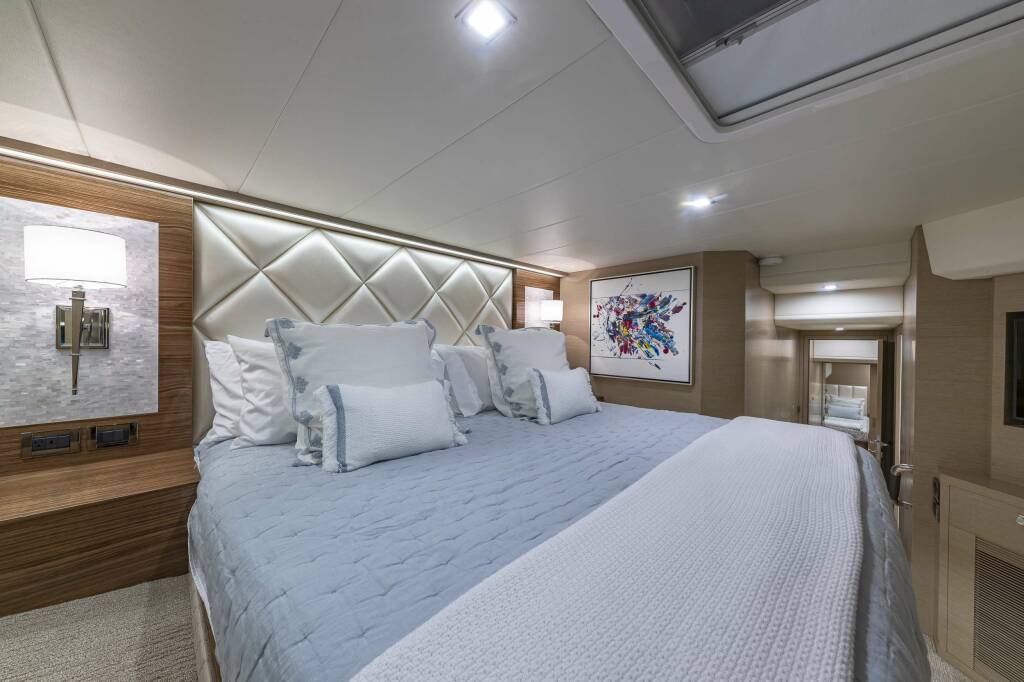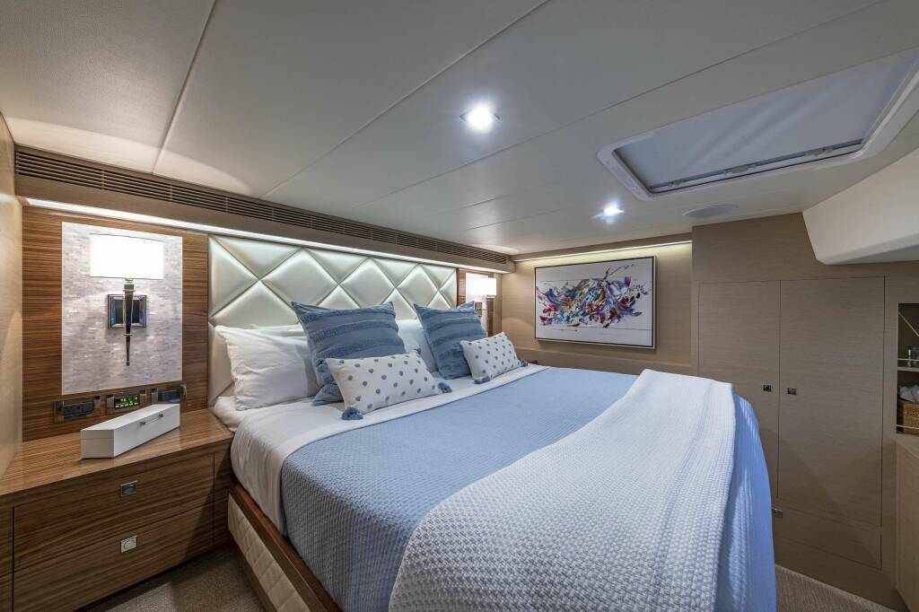 Featuring a Wyoming King Primary Stateroom (Bed Size 7ftx7ft) walk-around bed, reading lights, bedside USB and US plugs, a Fushion sound system, and a 32” smart TV. The stateroom has tinted, UV-rated windows and a luxurious ensuite with a walk-in shower, separate toilet, his and hers basins, cabinets, and vanity. The space is complete with a full-height closet and 6’8” headroom for added comfort.
