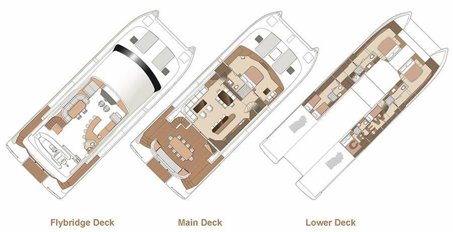 Accommodation: SEAGLASS 74 offers her guests bespoke comfort and room in a main-deck primary king suite, two forward king suites, and an amidships convertible twin -OR- king suite.