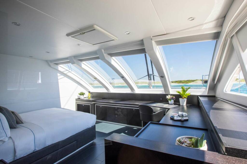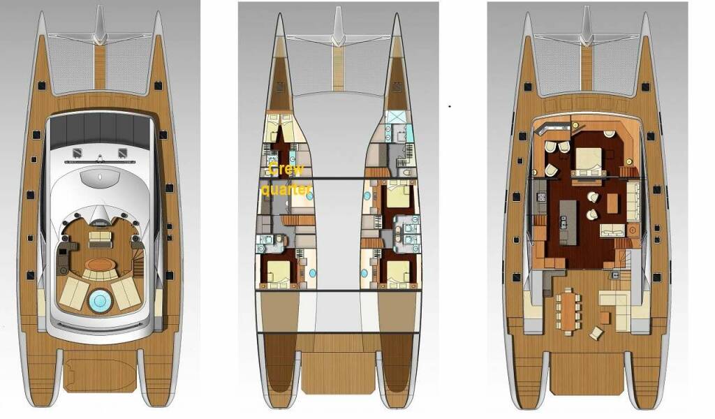 Large deck level to King master cabin with Ipad control AV and TV. 3 Queen size beds in guest cabins. Twin sinks, full size showers and dressing area. Queen size beds in guest cabins