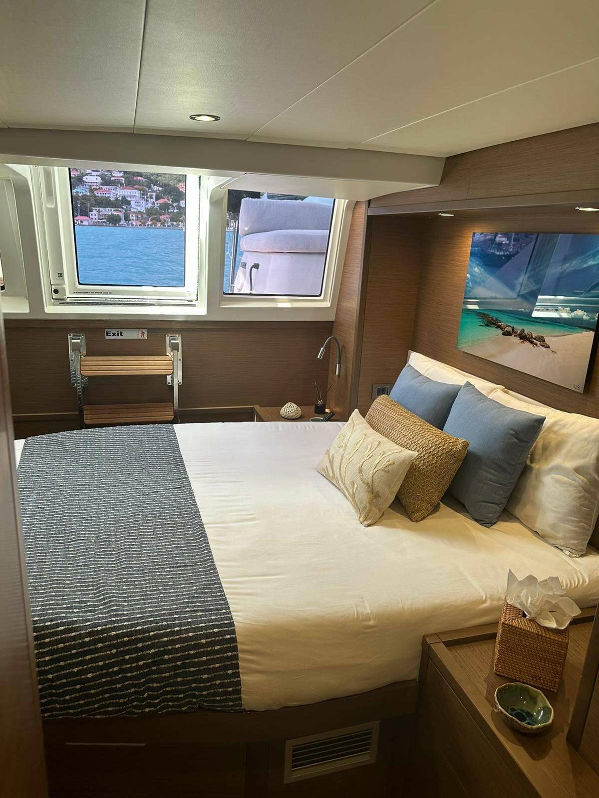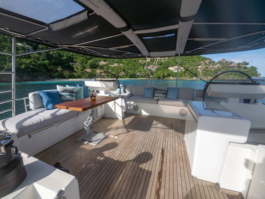 Large salon for lounging with a large pop-up TV, or formal dining. Large aft deck lounge and alfresco dining area with access to the water on two wide sugar scoops with SS steel ladders and deck showers. On top, a spacious fly-bridge with a 360-degree view, fridge, bar, and lounge area. On the bow, two large lounge areas, trampolines, and bow seats for spotting dolphins.