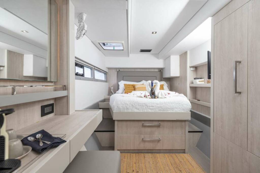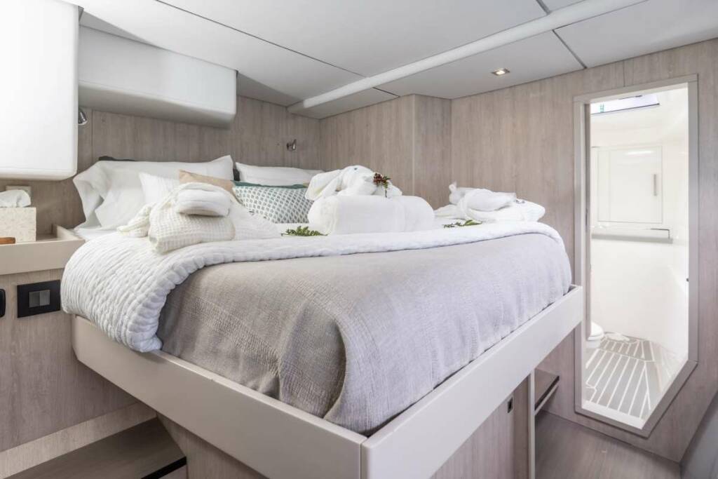 Accommodation: The Master Suite — A private sanctuary complete with a queen berth, spacious en-suite, air conditioning and its own coffee and espresso station for mornings on your terms. refined linens and curated details create