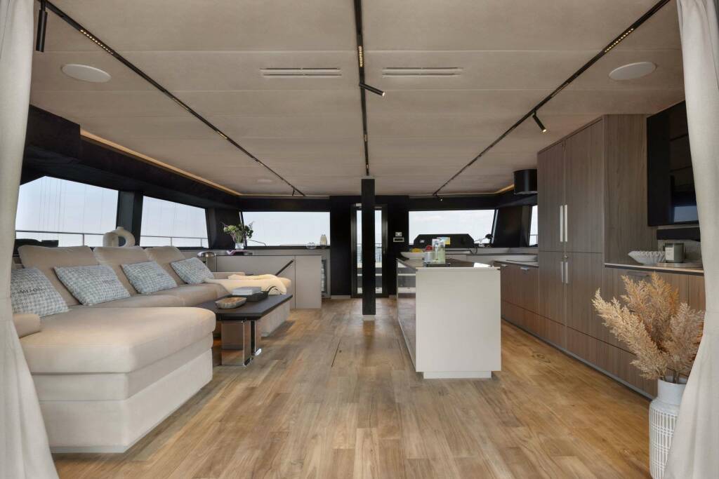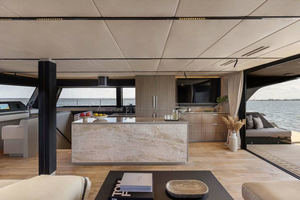 Main Salon: A bright, open-plan interior with panoramic views, sophisticated décor, and plush seating—perfect for relaxing or enjoying a movie.