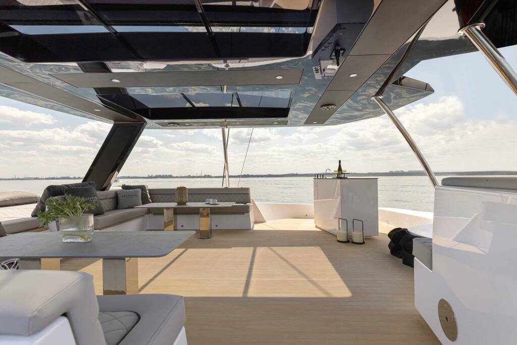 Aft Cockpit: A shaded outdoor lounge ideal for long, leisurely lunches, sunset cocktails, or watching the action in the water.