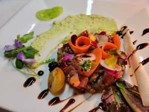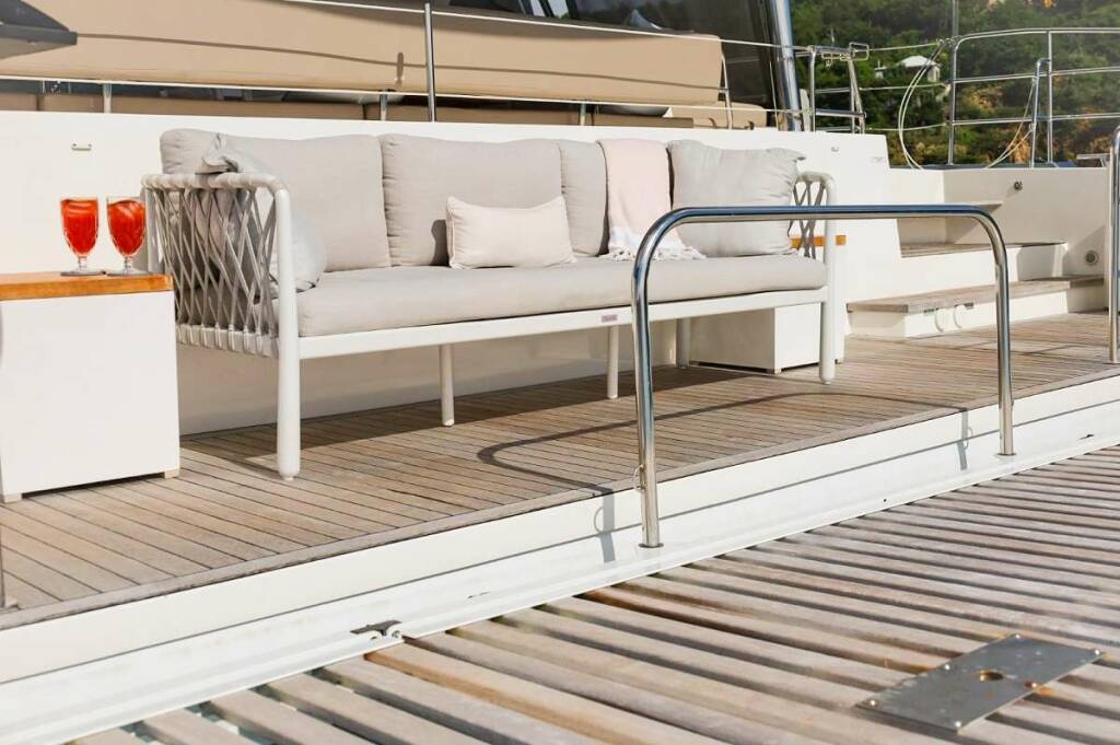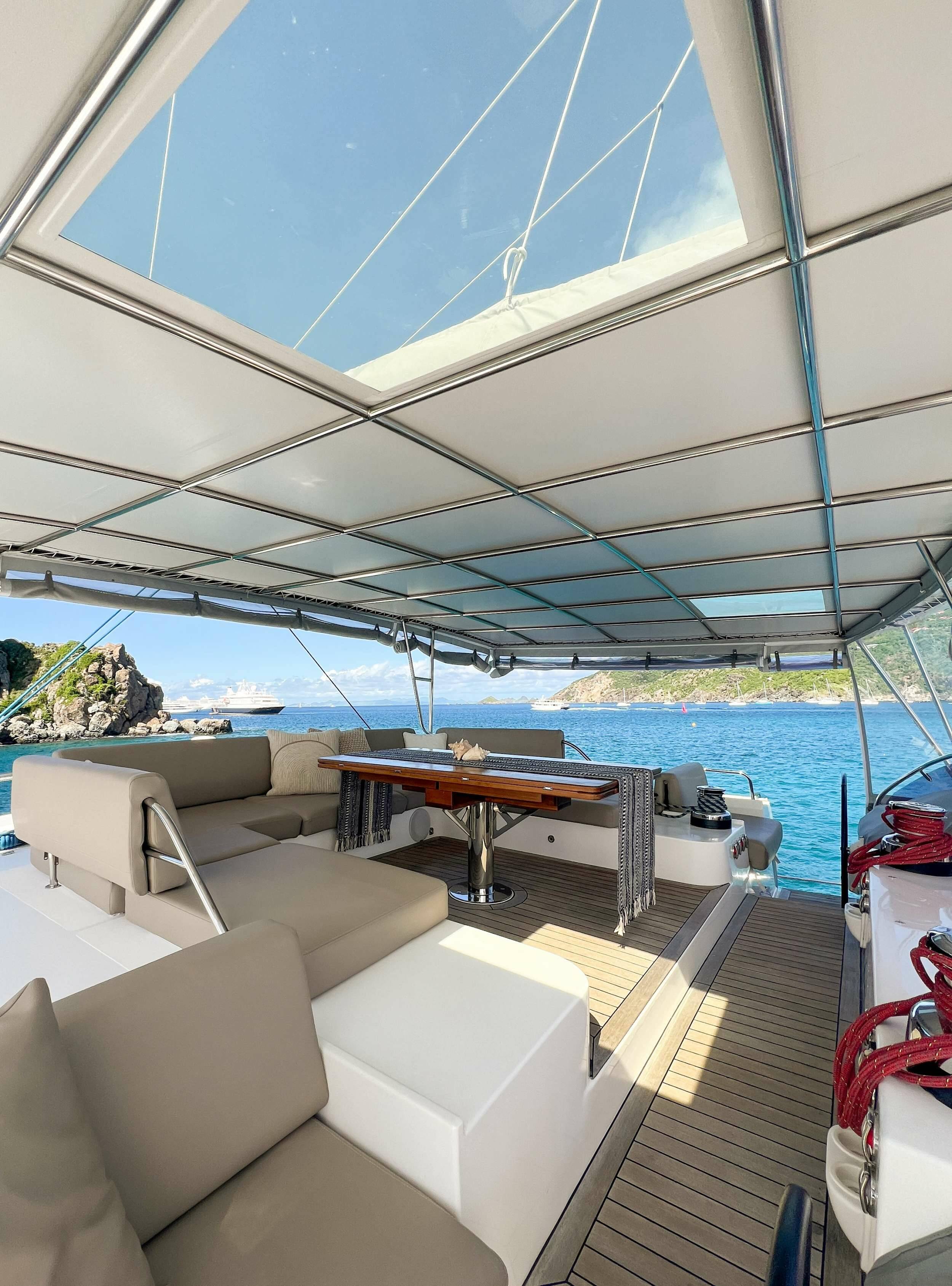 Guests can enjoy their gourmet meals inside the European designed salon or outside in the spacious cockpit.
