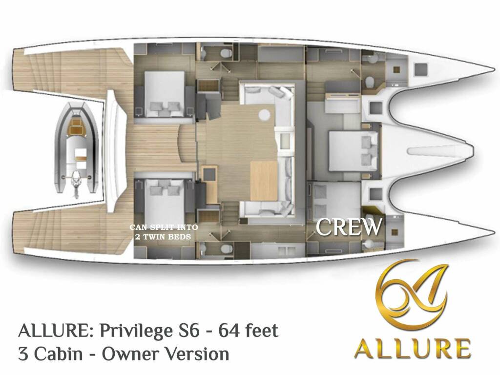 Accommodation: Allure is a 64ft Privilege owner edition and can accommodate up to 6 guests. The outstanding Owner's cabin and the 2 spacious Premium cabins are fully air conditioned and fitted with high end furniture and bedding. Of course all cabins have ensuite bathrooms and luxury toiletries are provided. One guest cabin can be converted from Queen to 2 single beds. All toilets have bidet function.