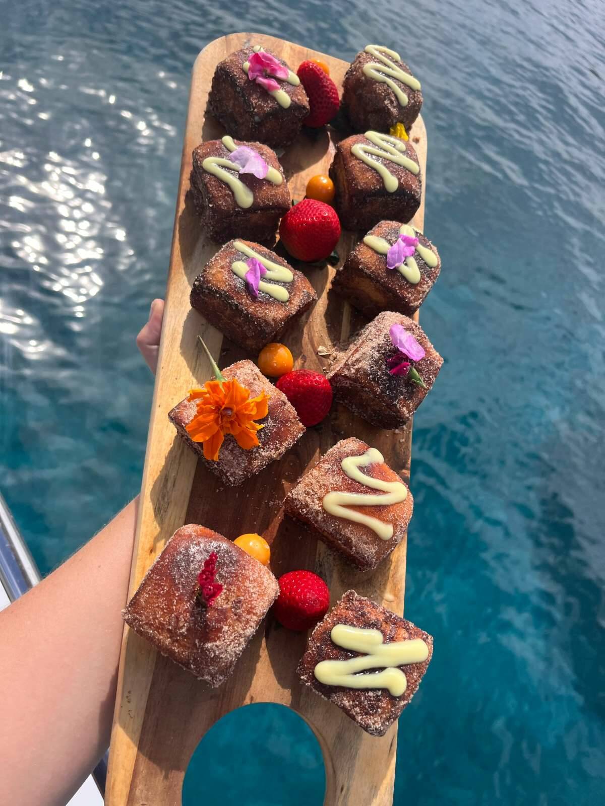 Guests especially love her extravagant fruit platters and signature charcuterie boards — beautifully curated and always a highlight on board. But for Kayla, food is just one part of the experience. From themed dinners and stunning tablescapes to island outings and personal touches, she loves creating immersive moments that guests remember long after their charter ends.